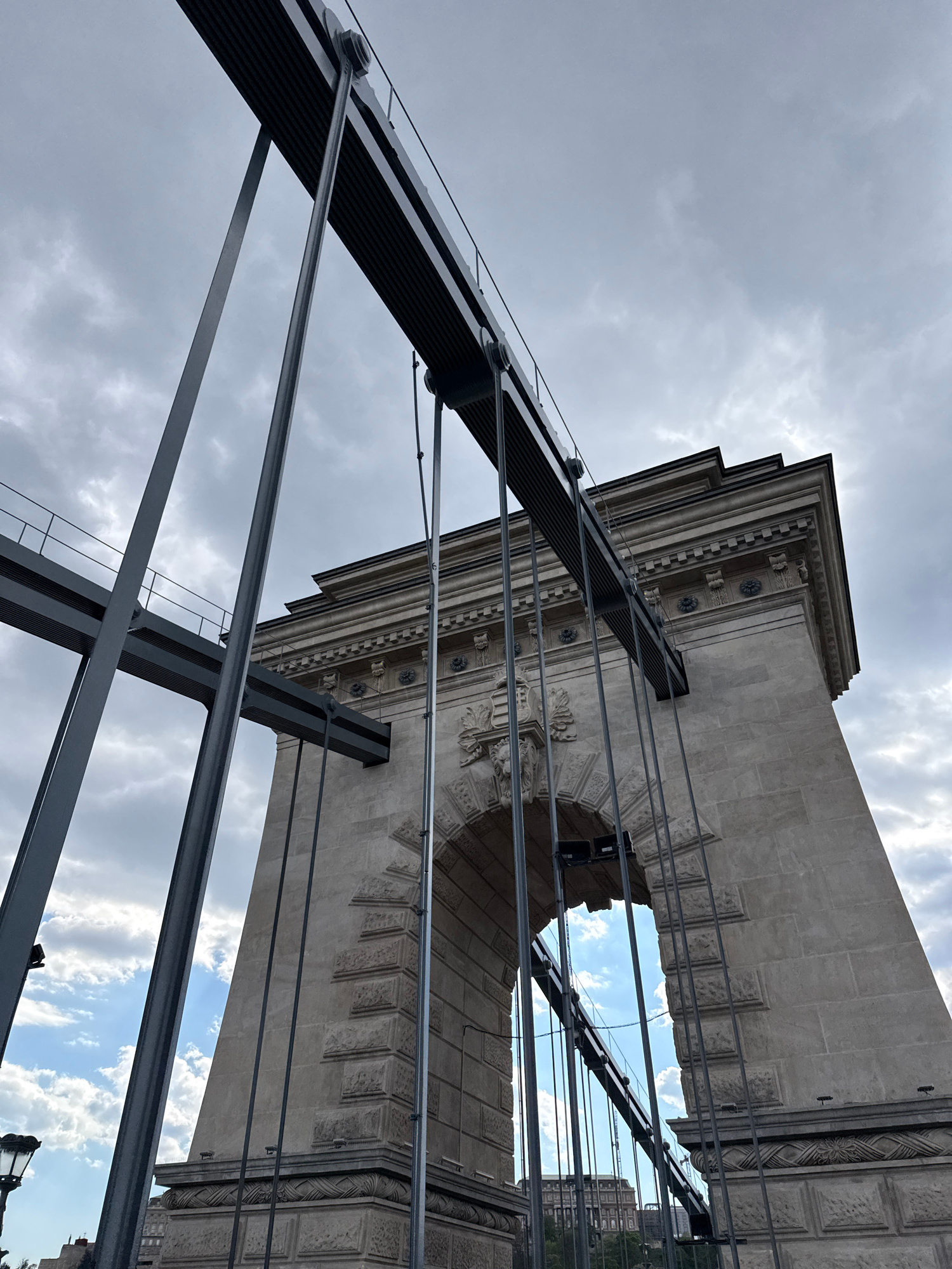 An upward-looking photograph captures a grand stone archway, likely a tower of a historic bridge, set against a partially cloudy sky. The perspective is taken from below and slightly to the side, emph…read more