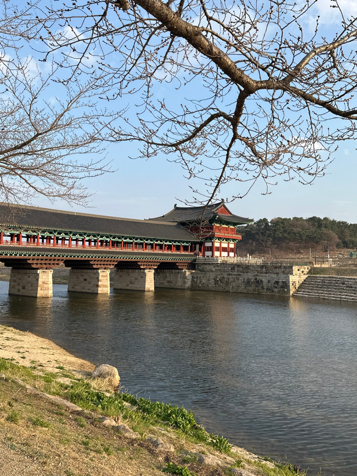 The photograph displays the Woljeonggyo Bridge, a traditional covered wooden bridge, spanning the Muncheon Stream in Gyeongju-si, South Korea. The bridge features a long, dark-tiled roof, supported by…read more