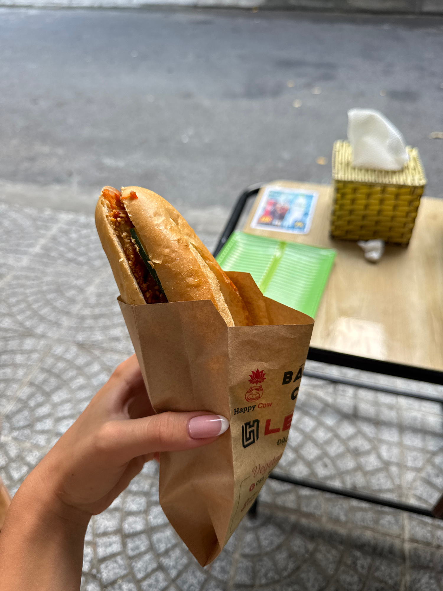 An eye-level, medium shot shows a baguette-style sandwich in a brown paper bag held by a fair-skinned human hand with pink and white manicured nails. The sandwich appears to be stuffed with meat and l…read more