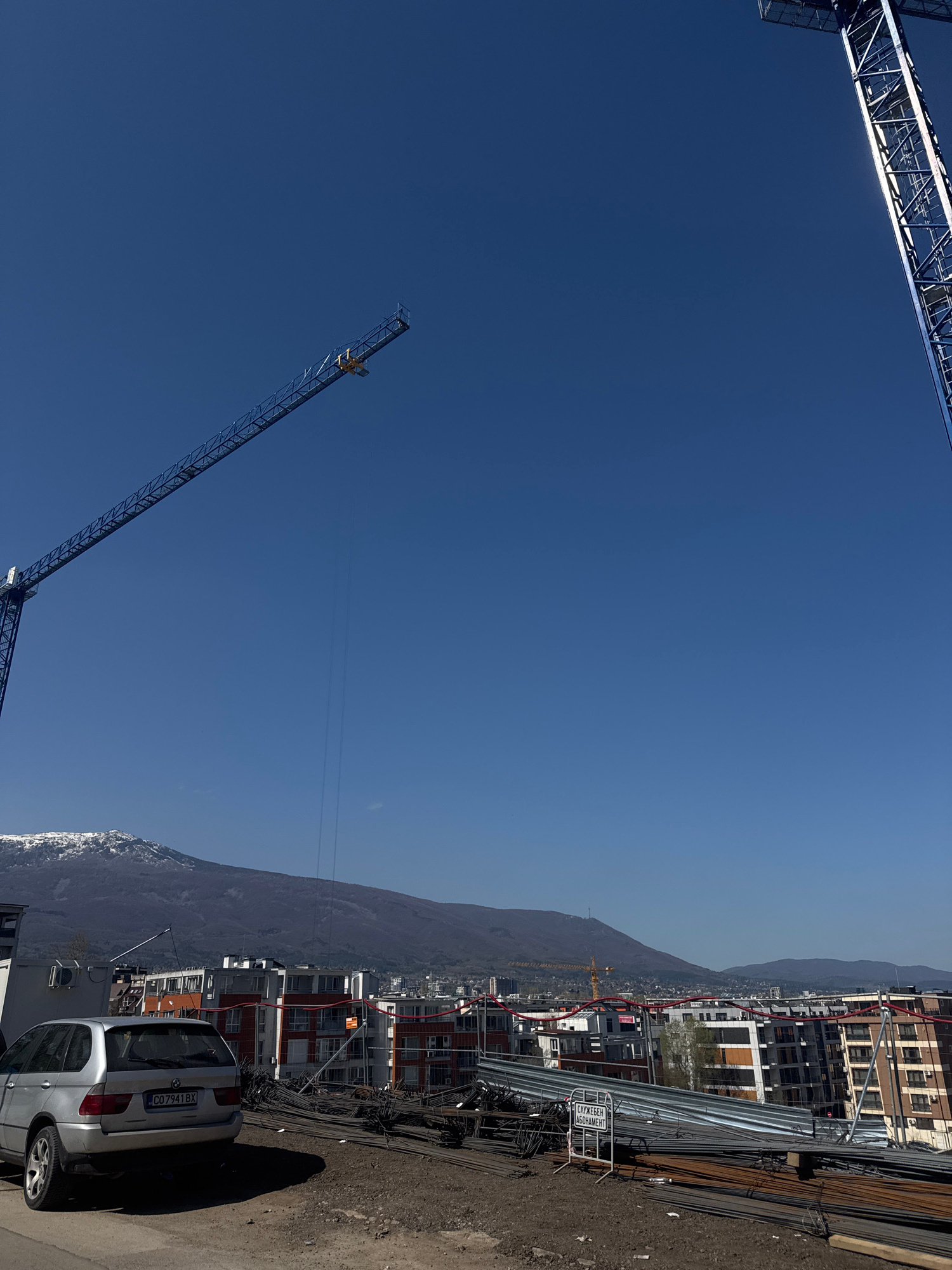 This image captures a vibrant construction scene in Sofia, Bulgaria, under a clear, bright blue sky. Two large tower cranes are prominent, with one partially visible in the upper left corner and anoth…read more
