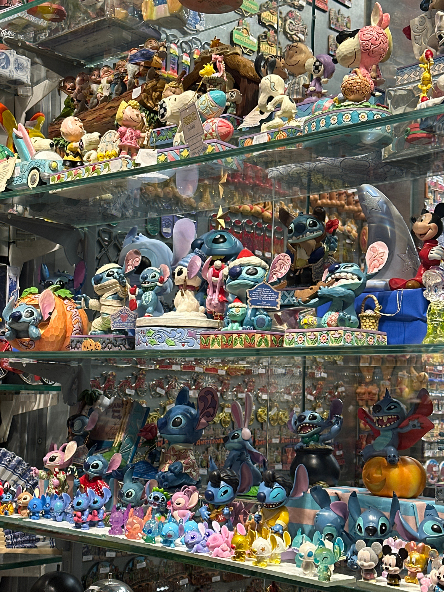 The image shows a display case filled with collectible figurines in Amsterdam, Netherlands. The figurines primarily consist of Disney characters, most notably Stitch from "Lilo & Stitch," and also som…read more