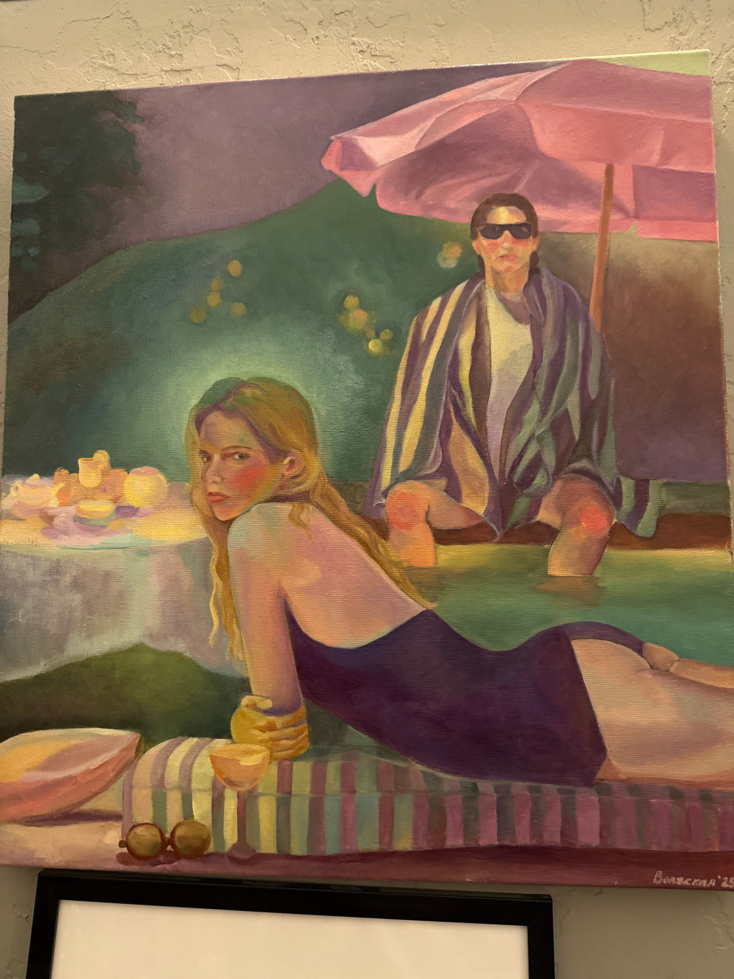 This painting depicts two figures enjoying a leisurely outdoor scene, with the provided image showing the artwork rotated 90 degrees clockwise. In the foreground, a blonde woman with fair skin and ro…read more