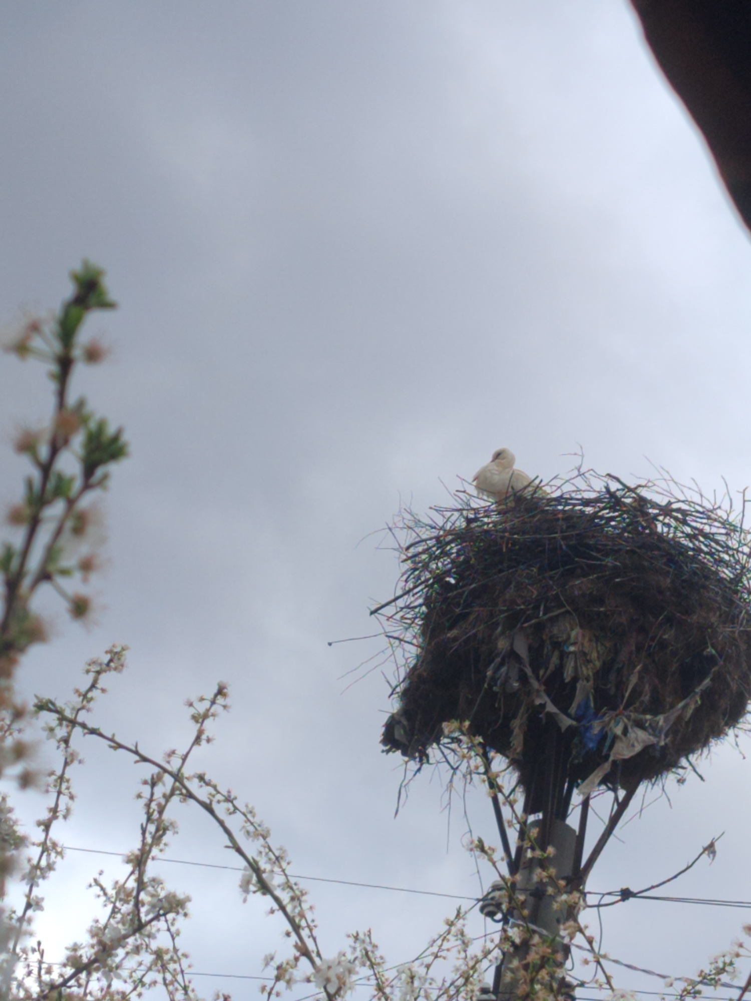 The image shows a stork nest atop a utility pole, likely in Varshilo, Bulgaria. The nest is large and composed of sticks, twigs, and plastic debris. A single white stork sits in the nest. Blooming tre…read more