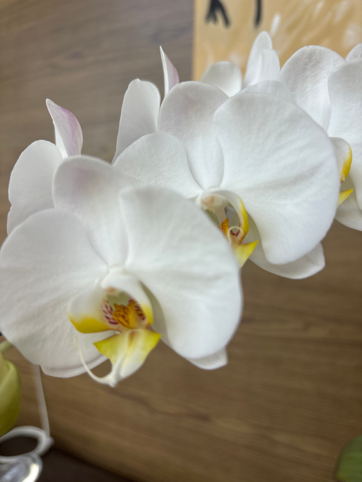 A close-up shot shows several white orchid flowers in bloom. The flowers are mostly white with yellow and some reddish-brown markings in their centers. The background appears to be a light brown, poss…read more