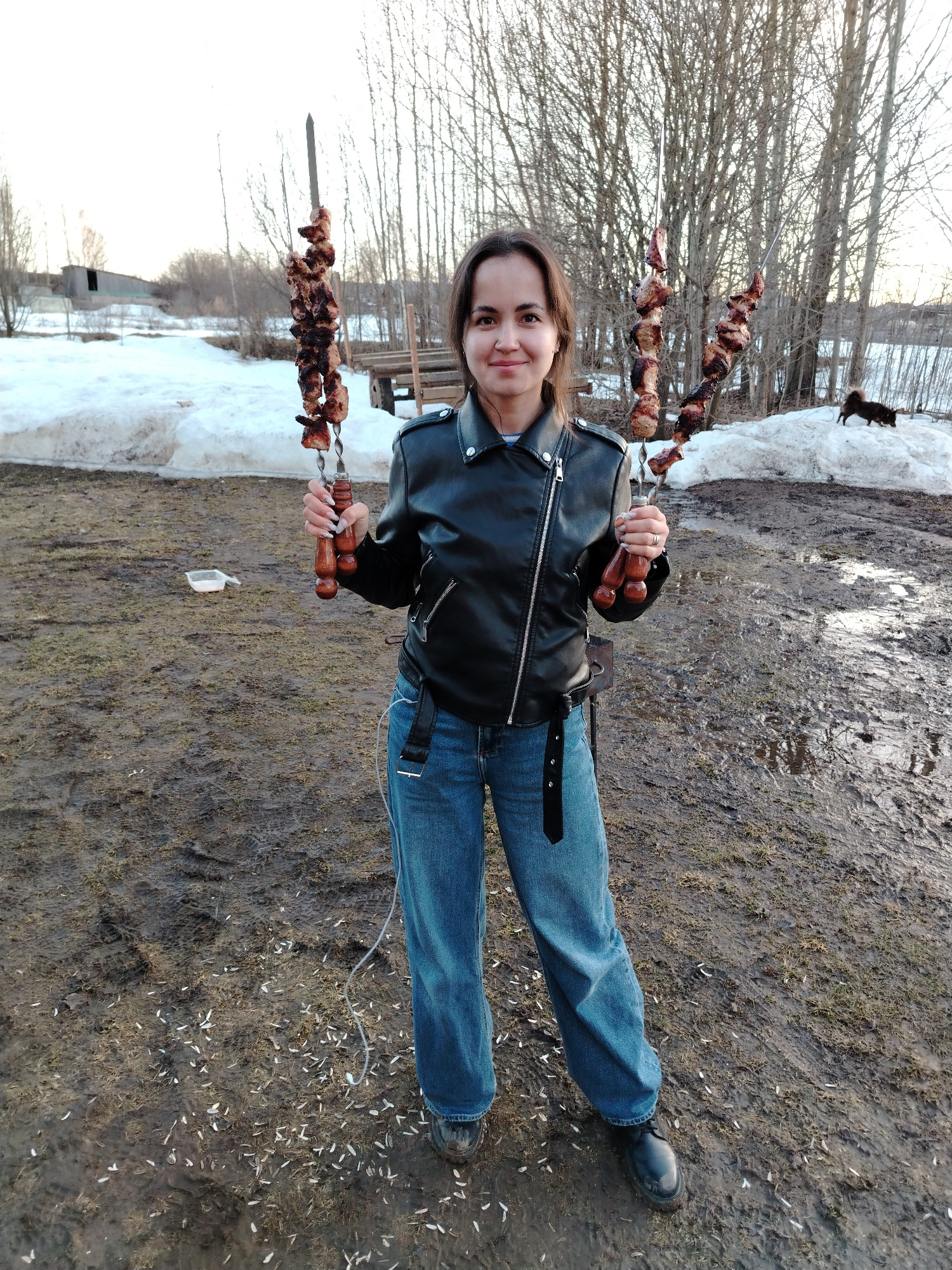 The image shows a woman standing in a muddy yard in what appears to be the city of Большая Уса, Russia. Patches of snow are visible in the background, suggesting a late winter or early spring season.…read more