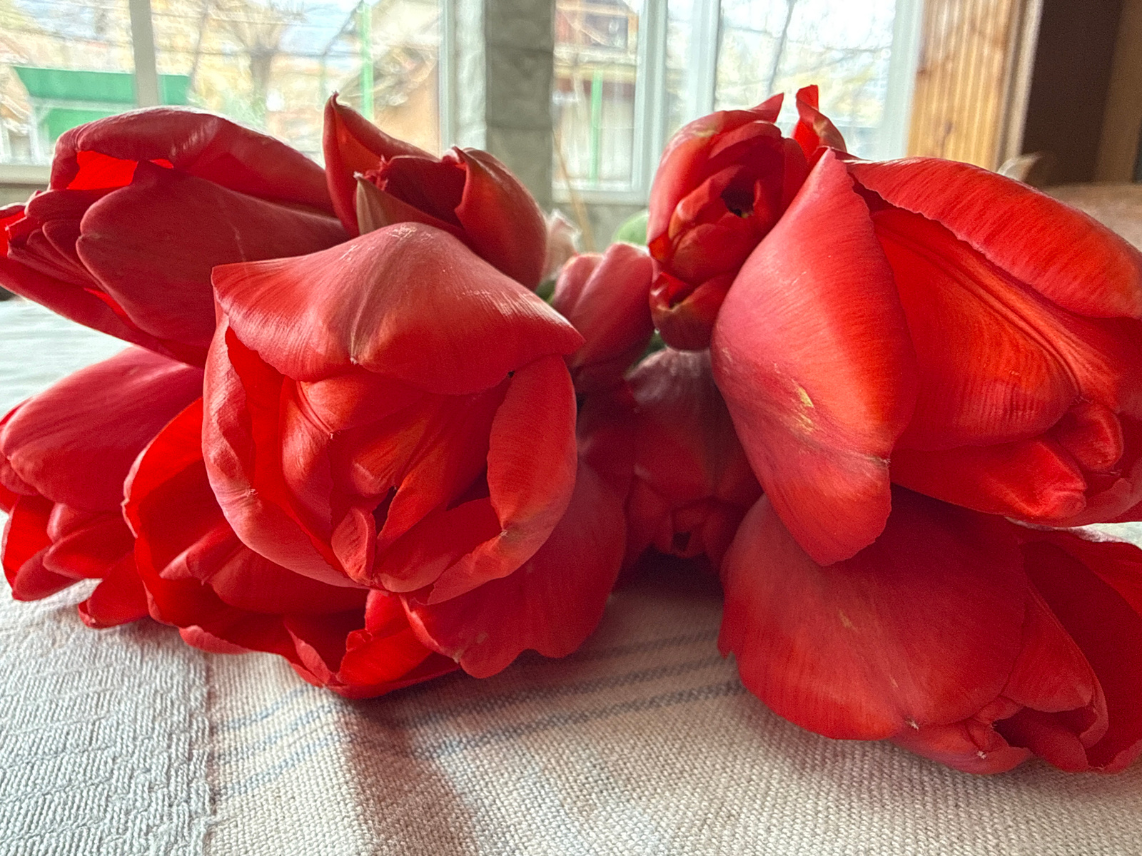 A close-up shot captures a cluster of vibrant red tulips arranged on a textured, light-colored fabric surface, possibly a tablecloth. The petals of the tulips are fully open, displaying their rich col…read more