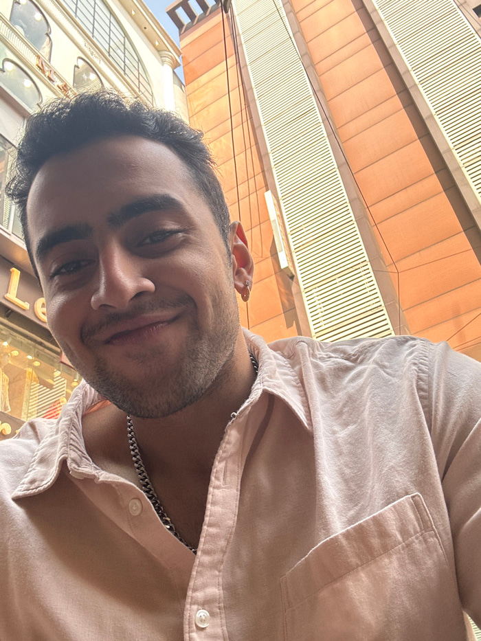 A man is captured in a close-up selfie, tilting his head slightly and smiling with a relaxed expression. He has short dark hair and a neatly trimmed beard or stubble. He is wearing a light-colored, po…read more