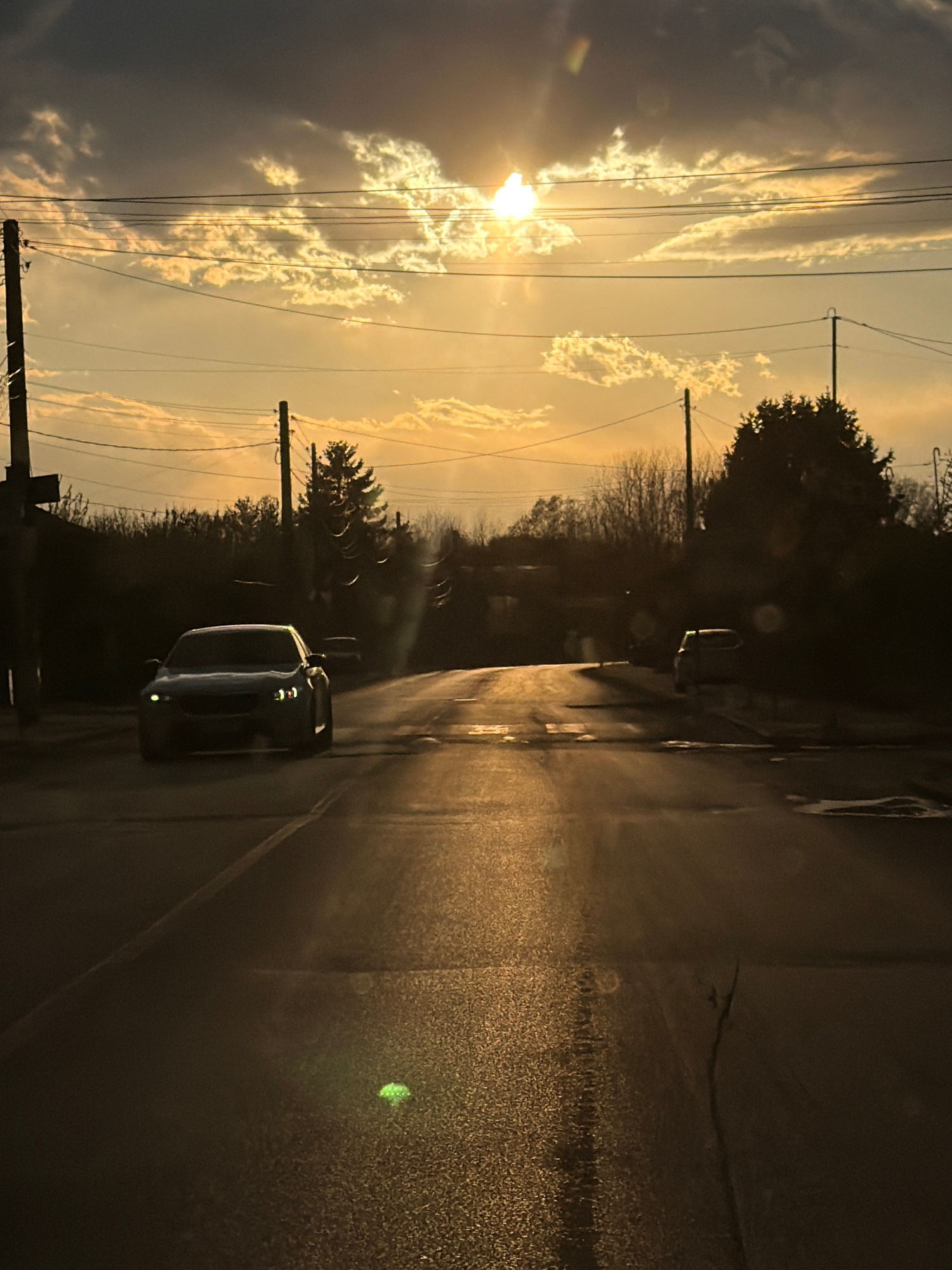 The image depicts a street scene, possibly in or near Yoakim Gruevo, Bulgaria. The sun is low in the sky, possibly during sunset or sunrise, casting a golden light. Clouds are visible in the sky, inte…read more
