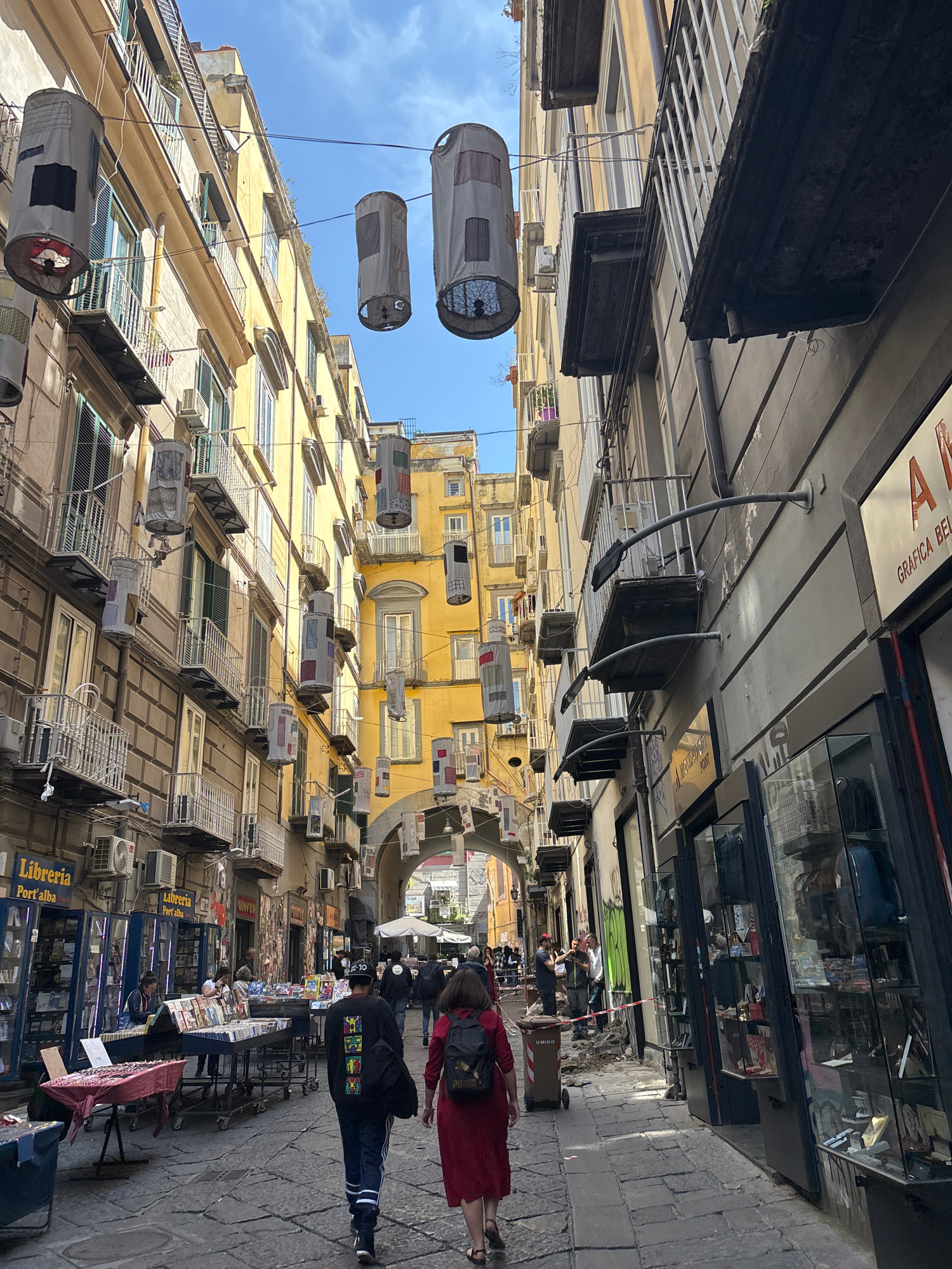 The image shows a narrow street scene in Naples, Italy. The architecture consists of tall, densely packed buildings with yellow facades, many windows, and numerous air conditioning units. Fabric cylin…read more