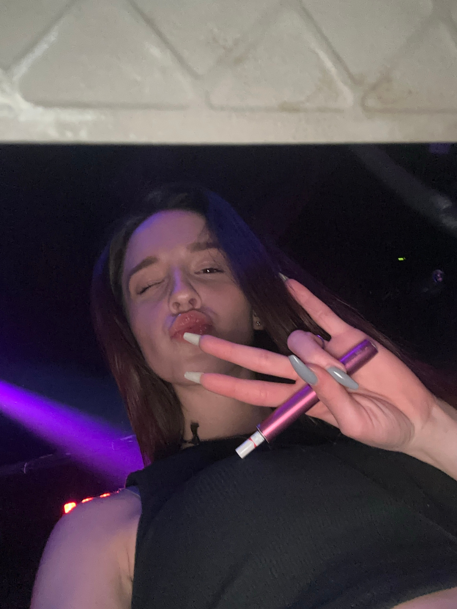 A woman is holding a pink pen-like object in her left hand, making a peace sign with the hand, with her left eye squinted and lips pursed. She is wearing dark clothing. Behind the woman, a neon purple…read more