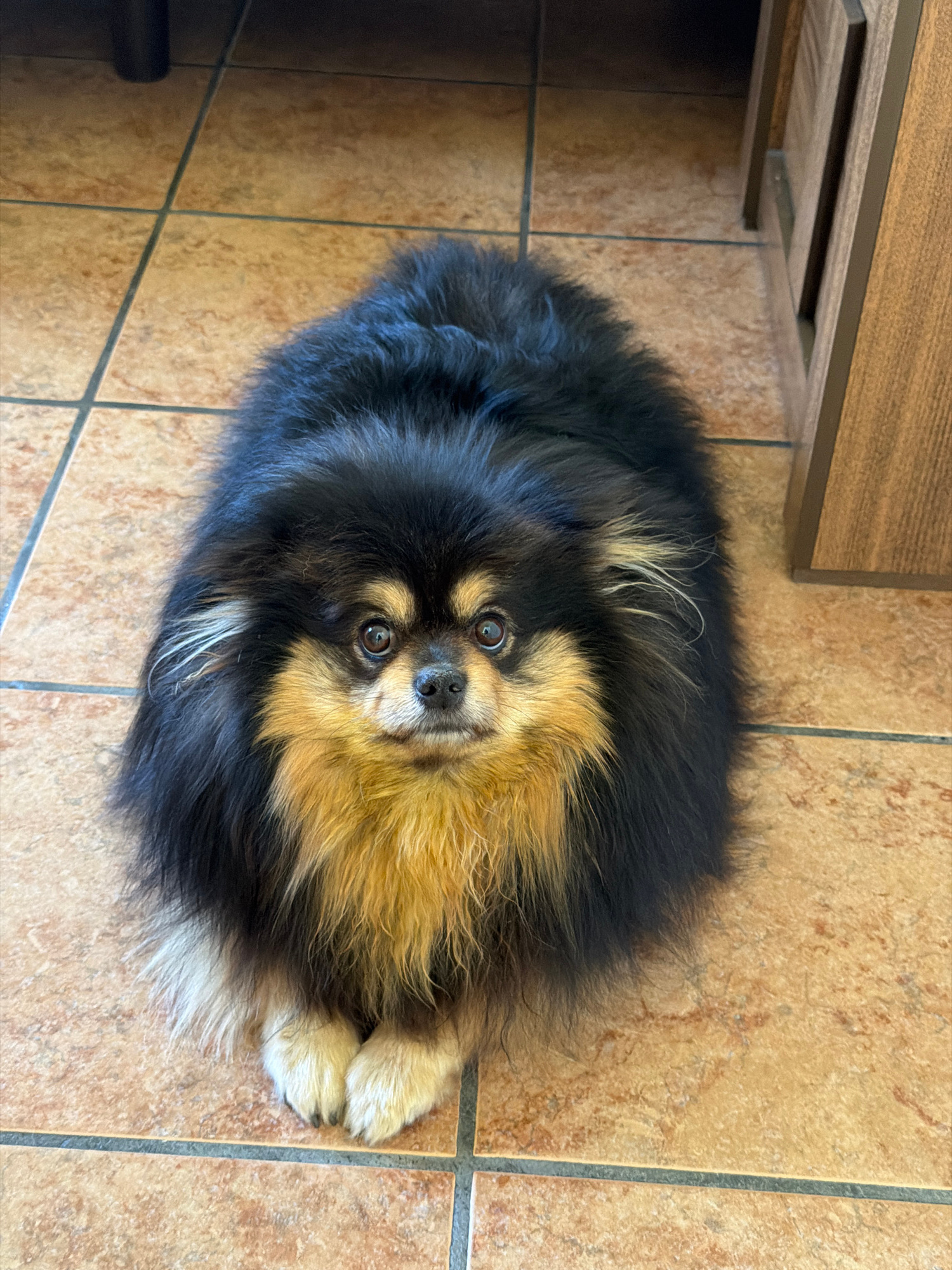 A Pomeranian dog with black and tan fur lies on a light brown tiled floor. The floor is covered with square tiles. The dog is near the edge of a cabinet with wooden paneling. The location is in Cuautl…read more
