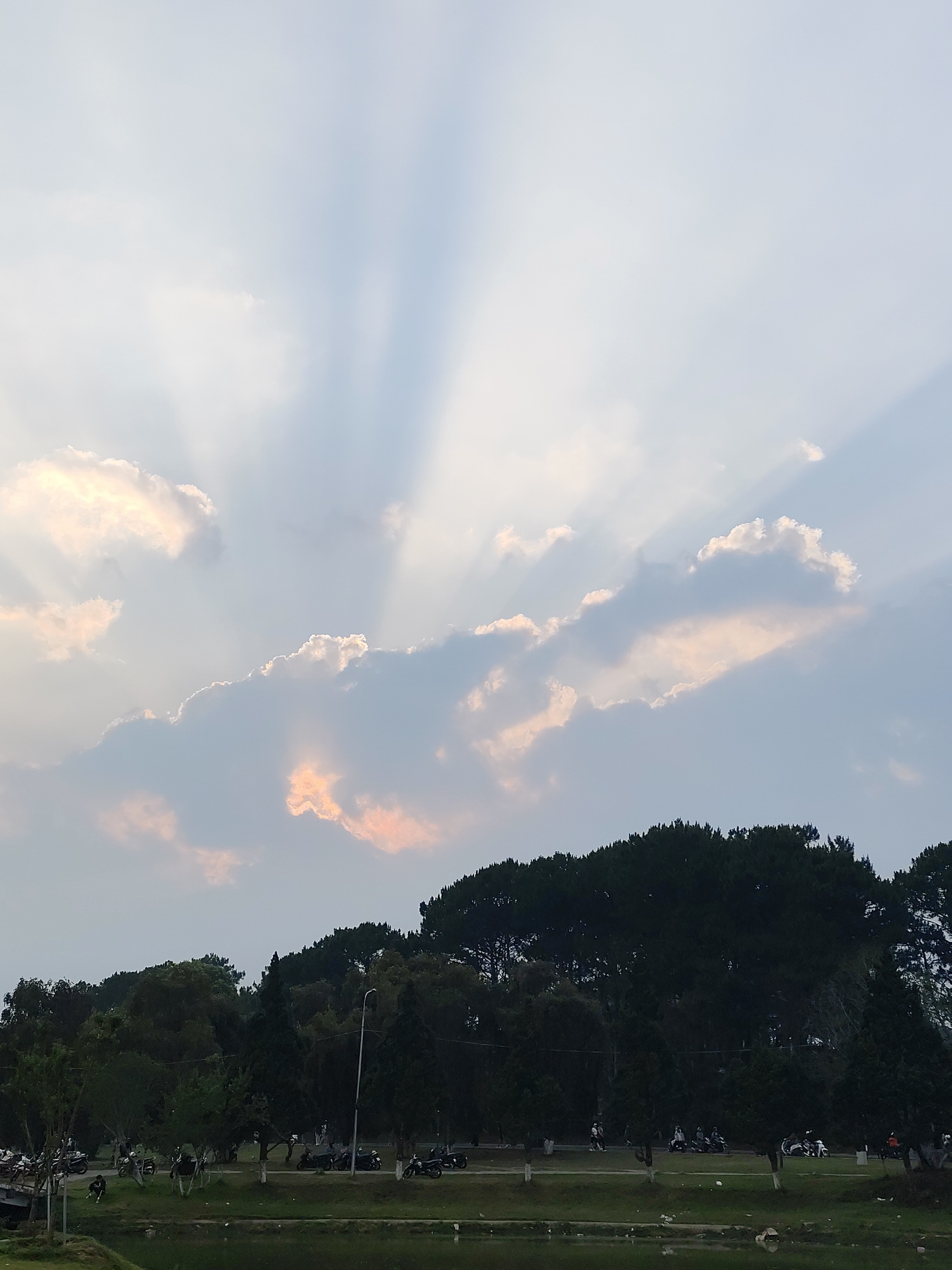 The image captures a landscape in Da Lat, Vietnam, identified by its characteristic pine trees and cool climate. The foreground shows a green field and a pond or lake with visible debris. In the middl…read more