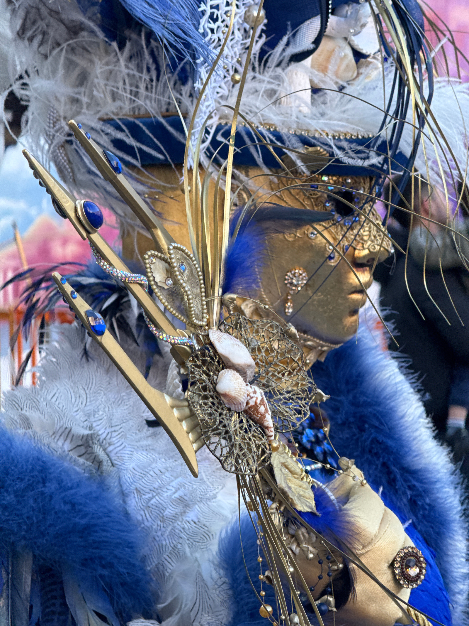 A close-up, profile view from the right captures an individual adorned in an elaborate blue, white, and gold costume, characteristic of the Venice Carnival in Venice, Italy. The subject wears a gold m…read more