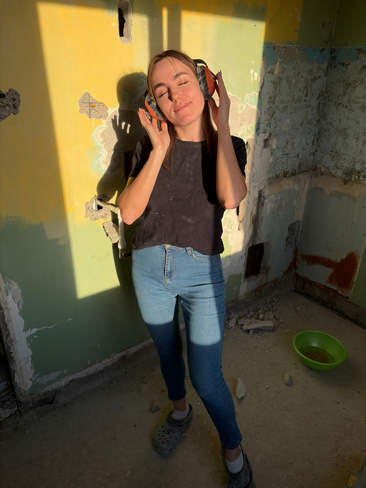 A woman with brown hair is lying on her side in the corner of a room undergoing renovation. She is wearing blue jeans, a black t-shirt, safety goggles on her forehead, and headphones around her ears.…read more