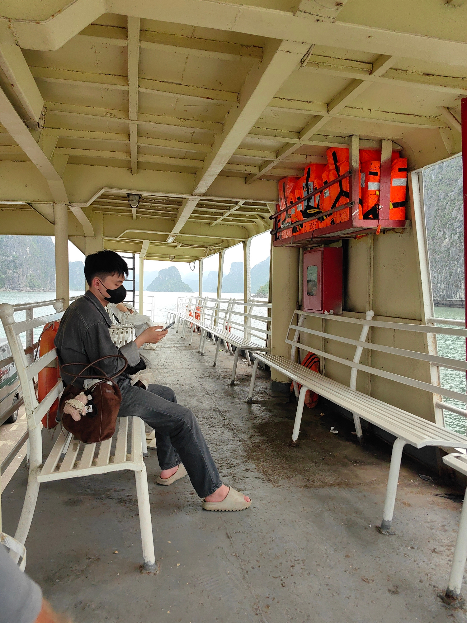 A person wearing a black face mask, grey denim shirt, and grey jeans sits on a white bench on a ferry. They are holding a phone and a brown handbag is next to them. Life jackets are stored above a redβ¦read more