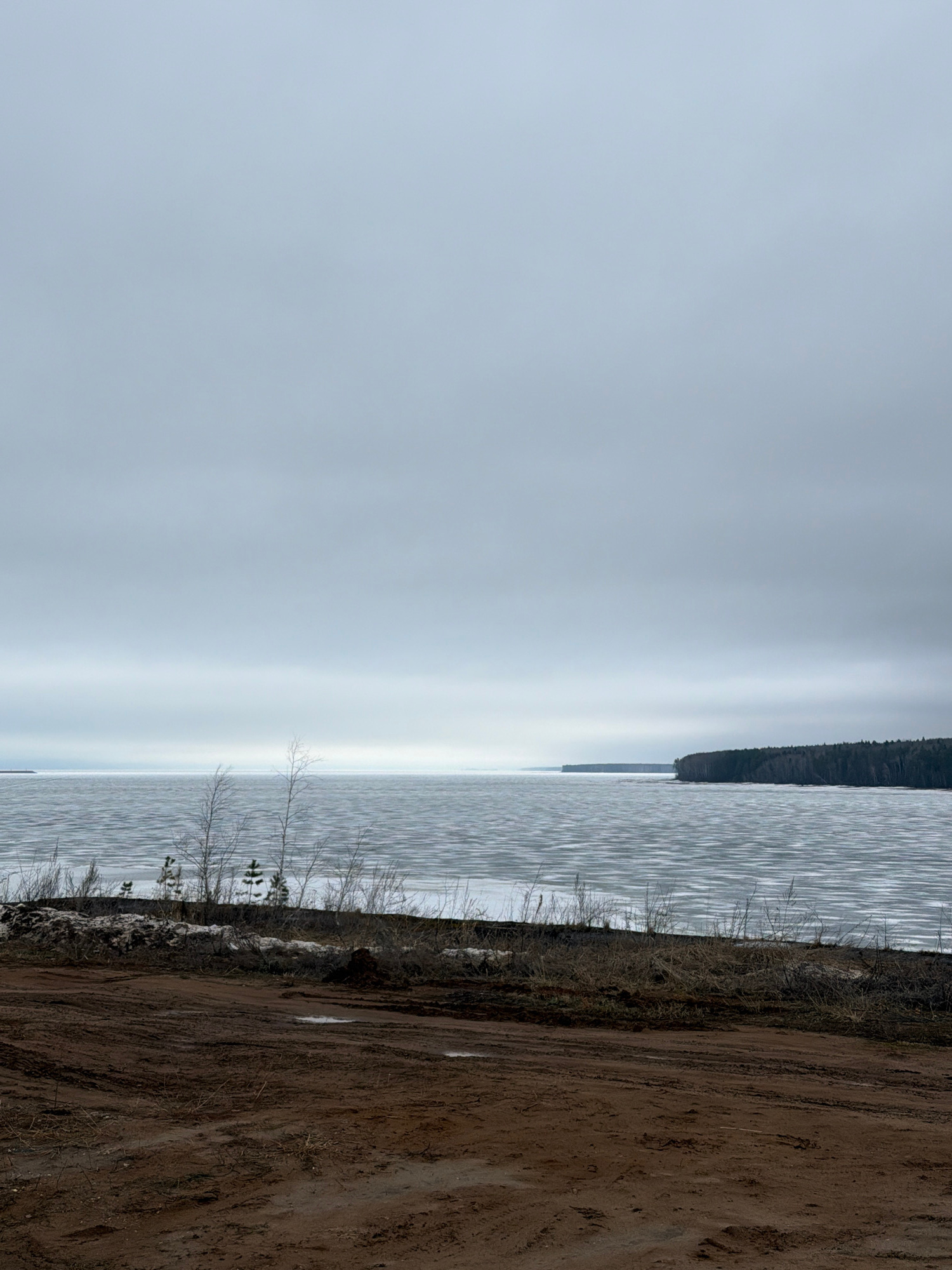 The image shows a landscape under a cloudy sky. On the left side of the image, there is a large body of water. A thin, dark line, possibly a forest, is visible in the distance across the water. The ri…read more