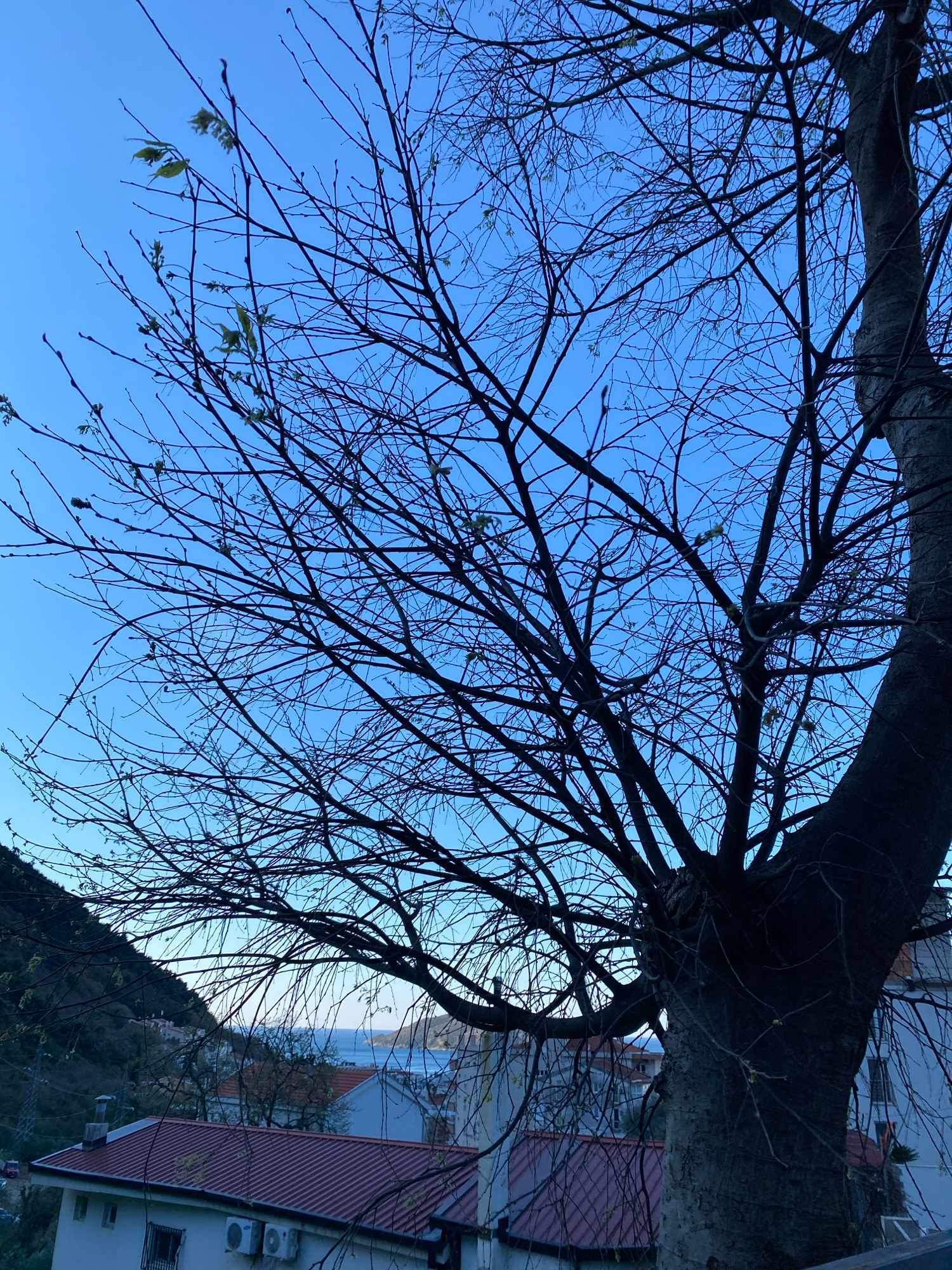 The image shows a low-angle view of bare tree branches against a clear, bright blue sky. Some buds and small leaves are emerging on the branches. Behind the tree, there's a partial view of a building…read more