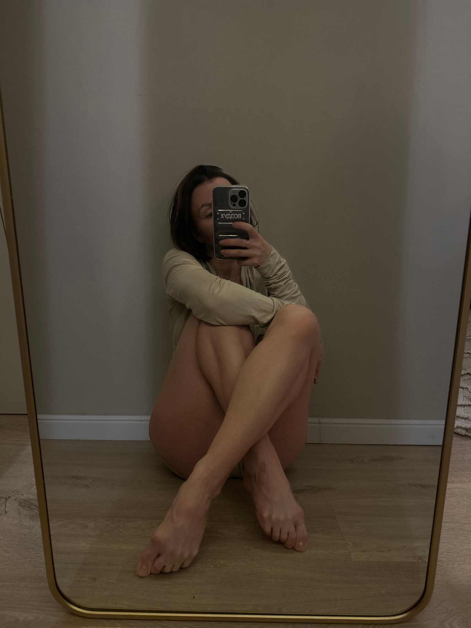 A mirror reflection shows a person curled up in a fetal position on a floor against a wall. The person is holding a phone with the case facing the mirror, obscuring their face. The floor appears to be…read more