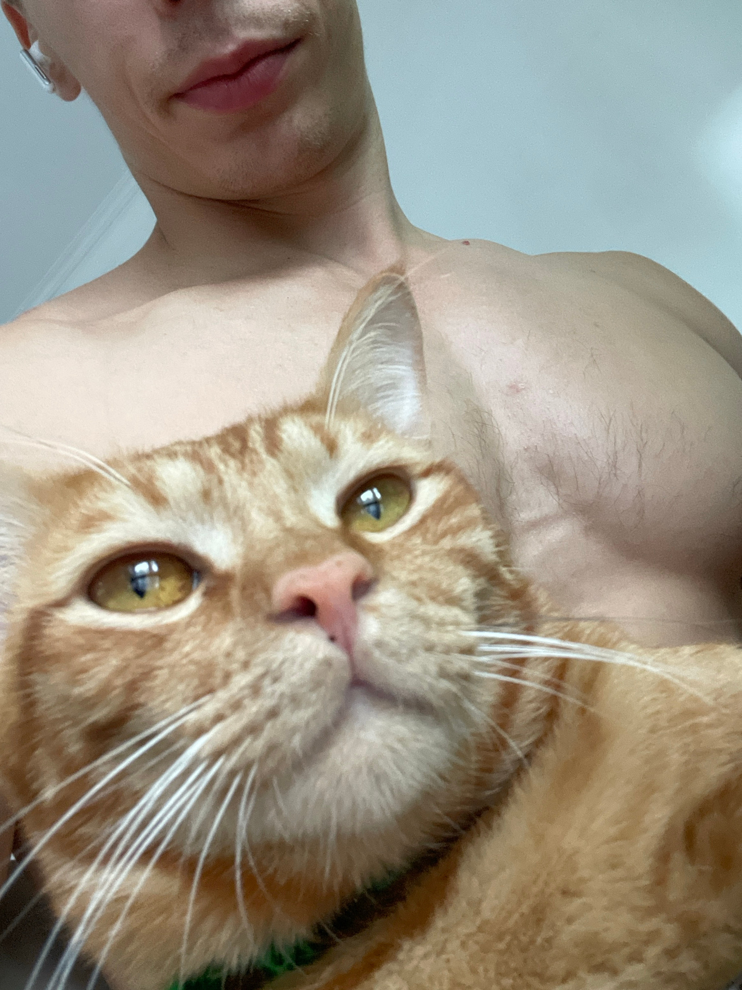 This close-up image features an orange tabby cat and a person, captured from a low-angle perspective looking upwards. The subjects appear to be looking down towards the camera. The dominant subject i…read more