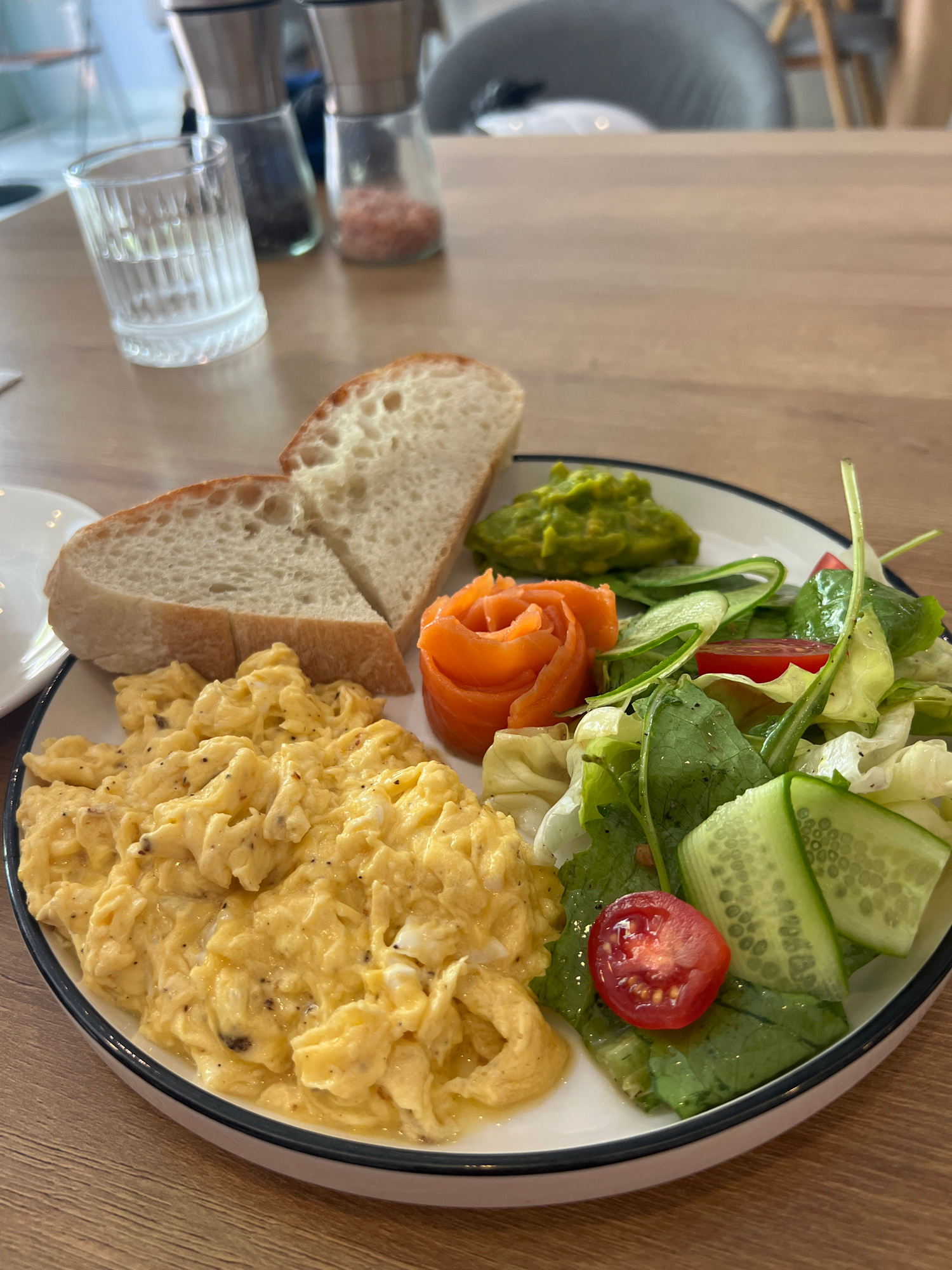 The image shows a plate of food on a wooden table. The plate contains scrambled eggs, two slices of bread, a salad with cucumbers and tomatoes, avocado, and smoked salmon formed into the shape of a ro…read more