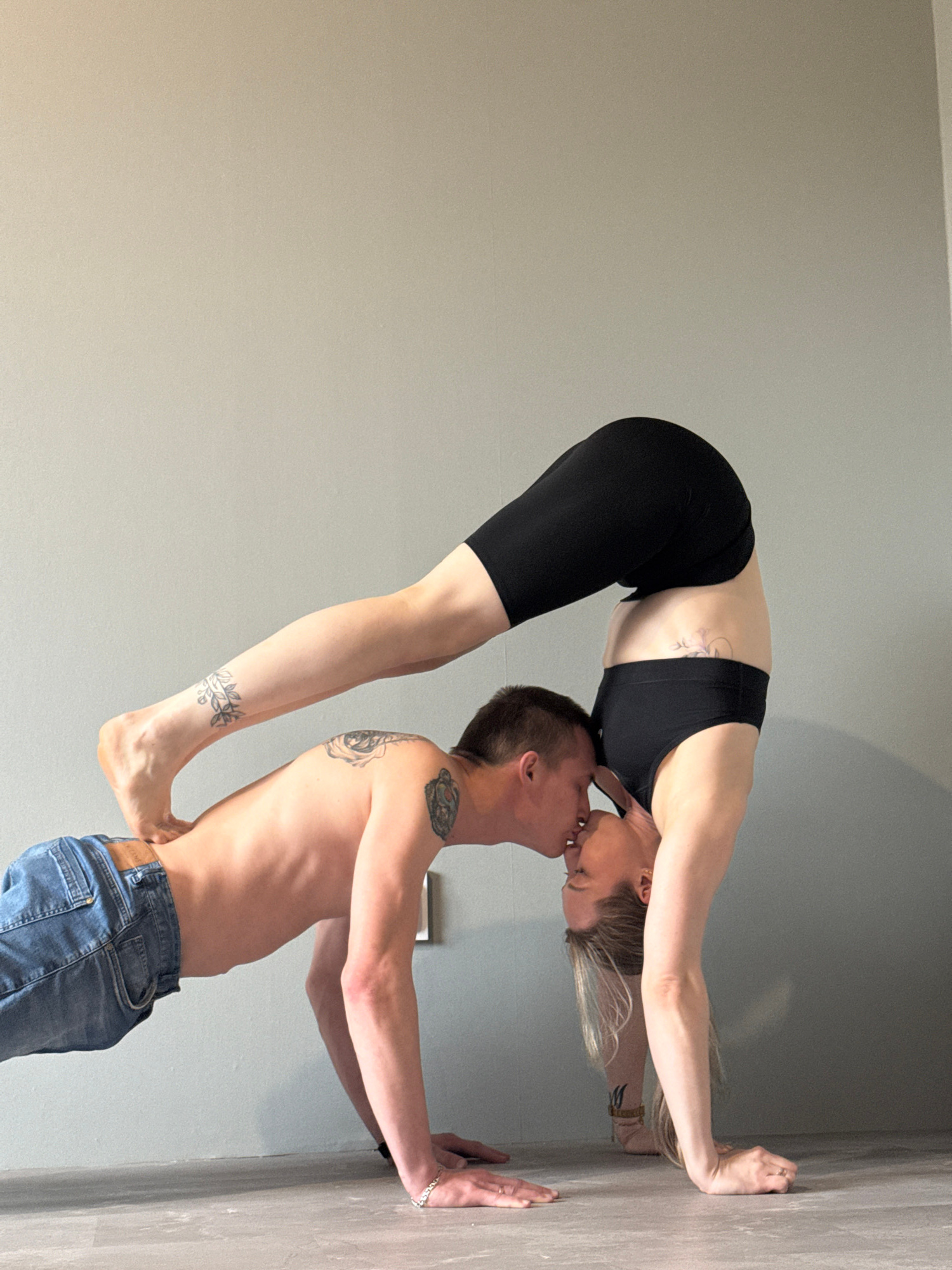 The image captures a man and a woman performing an intricate partner acrobatic or acro-yoga pose indoors. The man, shirtless and wearing blue jeans, stands with his back slightly turned towards the vi…read more