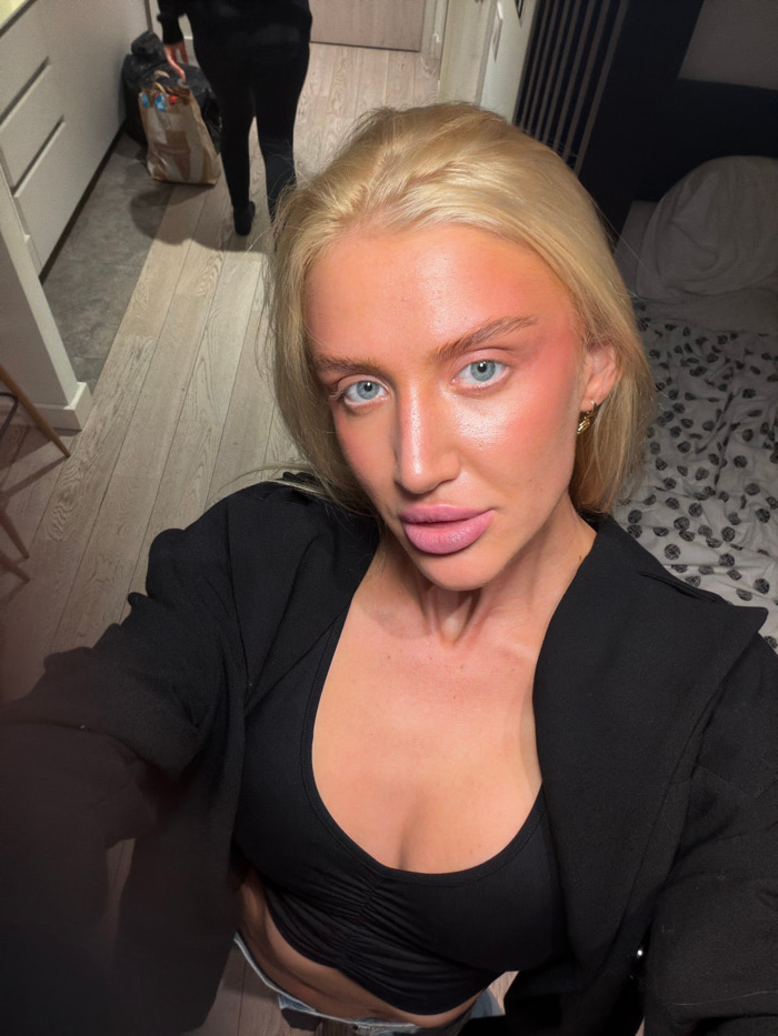 A woman with blonde hair and striking blue eyes is shown from a high-angle perspective. She wears a black top with a subtle décolletage. Light blush accents her cheekbones. She is indoors, a wooden fl…read more