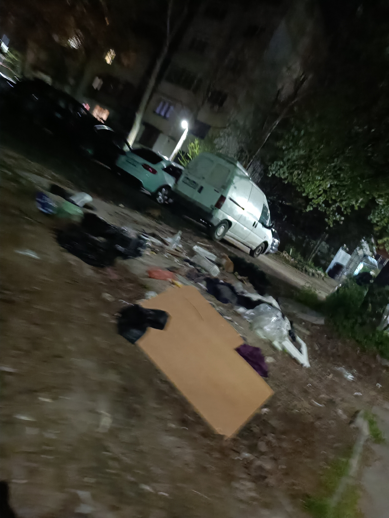 The image depicts a trash-strewn area in Pleven, Bulgaria, at night. The scene includes assorted garbage, such as plastic bags, discarded items, and a large piece of cardboard lying on the ground. In…read more