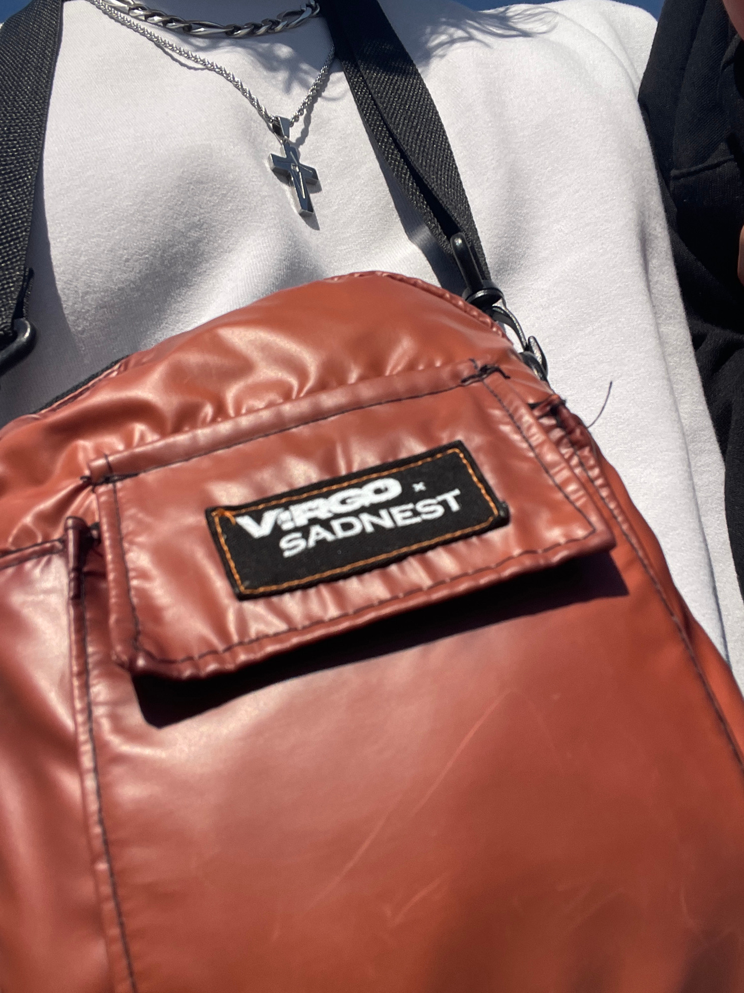 The image shows a portion of a person wearing a white shirt with a silver cross necklace, a black strap, and a brown bag with a black patch reading "VIRGO x SADNEST" in white lettering. The bag appear…read more