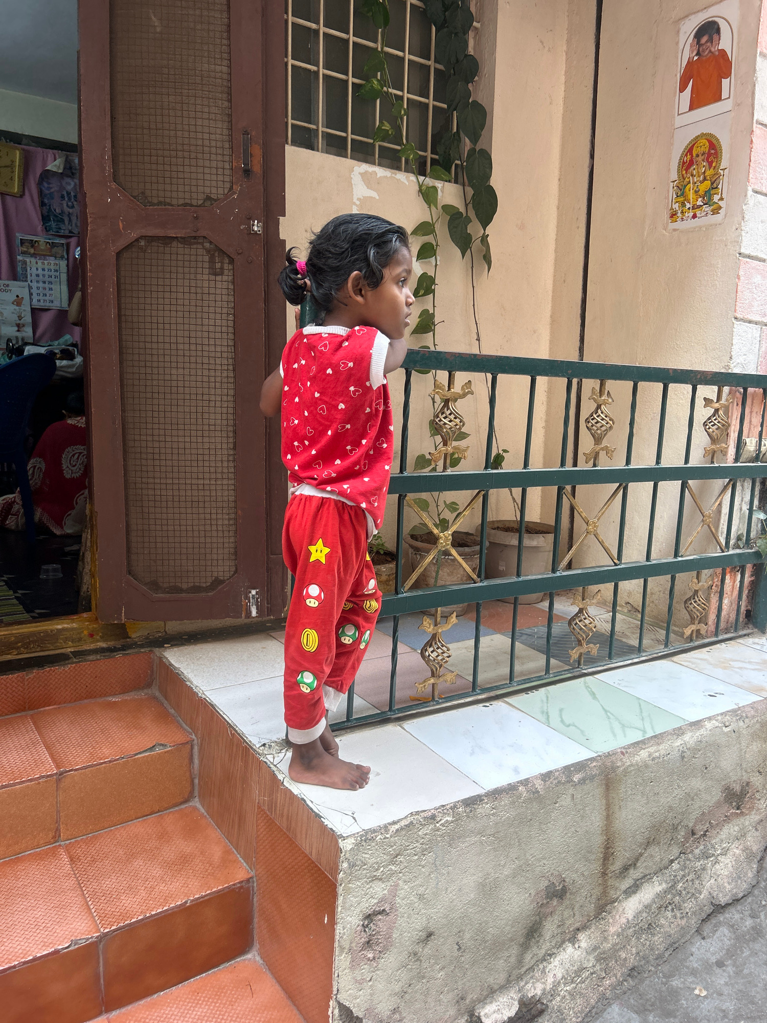 A young child, appearing to be Indian, stands barefoot on a tiled landing outside a building in Puttaparthi, India. The child wears a red sleeveless top with white heart patterns and red pants featuri…read more