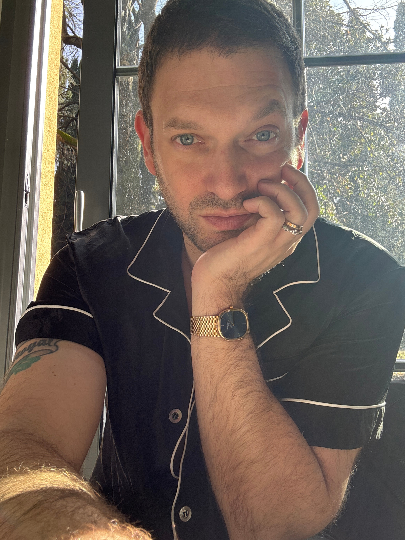 A male subject is depicted indoors, positioned directly in front of a window in Erba, Italy. The subject has short dark hair, light blue eyes, and light facial stubble. He is observed wearing a dark-cā¦read more