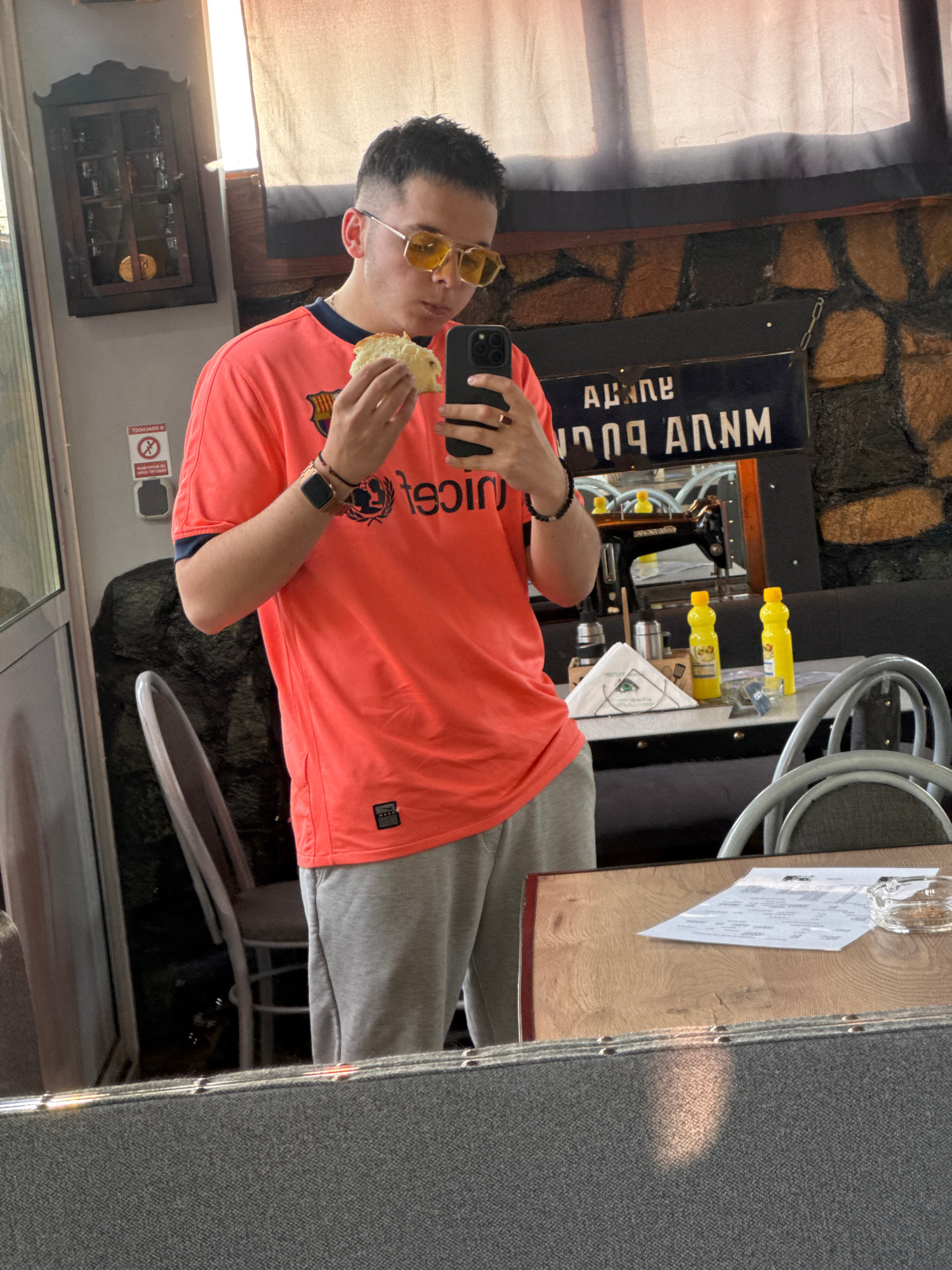 A man with short dark hair and wearing yellow-tinted glasses, an orange t-shirt with blue sleeves and a club logo, gray sweatpants, and a bracelet on his left wrist is taking a selfie with his black p…read more