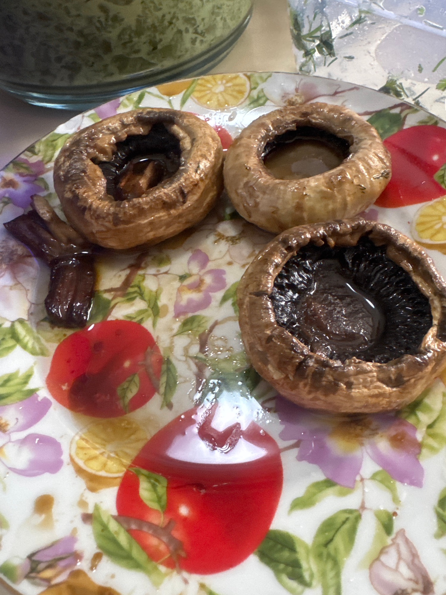 The image depicts a plate containing cooked mushrooms. There are three mushroom caps, two with dark interiors and one with a light interior. A small piece of mushroom stem lies near the bottom of theβ¦read more