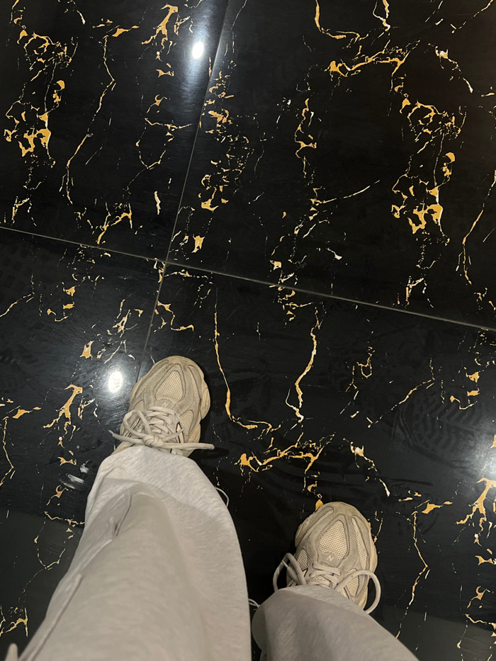 The image depicts an overhead view of a person's lower legs and feet positioned on a glossy, black tiled floor with intricate gold veining, resembling black Portoro marble. The floor is comprised of l…read more