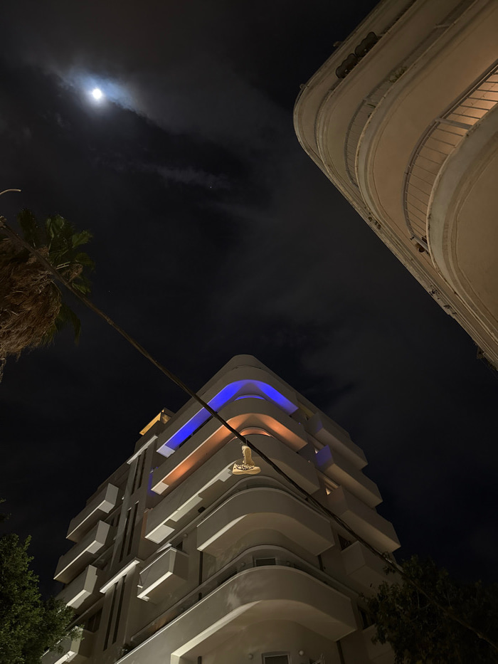 A low-angle shot captures two buildings against a night sky. The building on the left features rounded, light-colored balconies. The building on the right has a geometric design with blue and orange l…read more