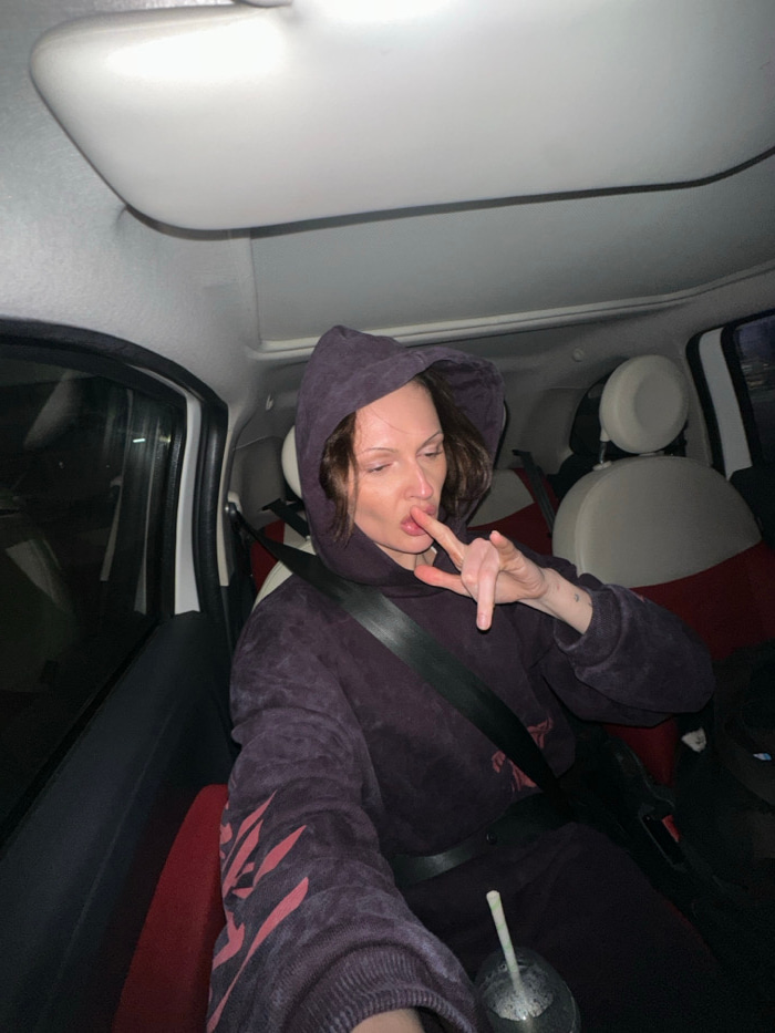 A person wearing a dark purple hoodie and pants, and a seatbelt is inside of a car. The person's left hand is near their mouth with their index and middle fingers extended. The car’s interior is mostl…read more