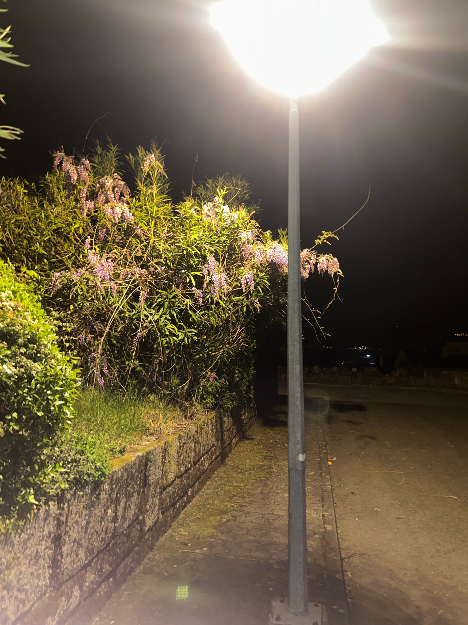 The image depicts a night scene in Vila Real, Portugal. A bright street lamp illuminates a bush with purple flowers that grows along a stone wall. The light also casts a glow on a section of sidewalk…read more