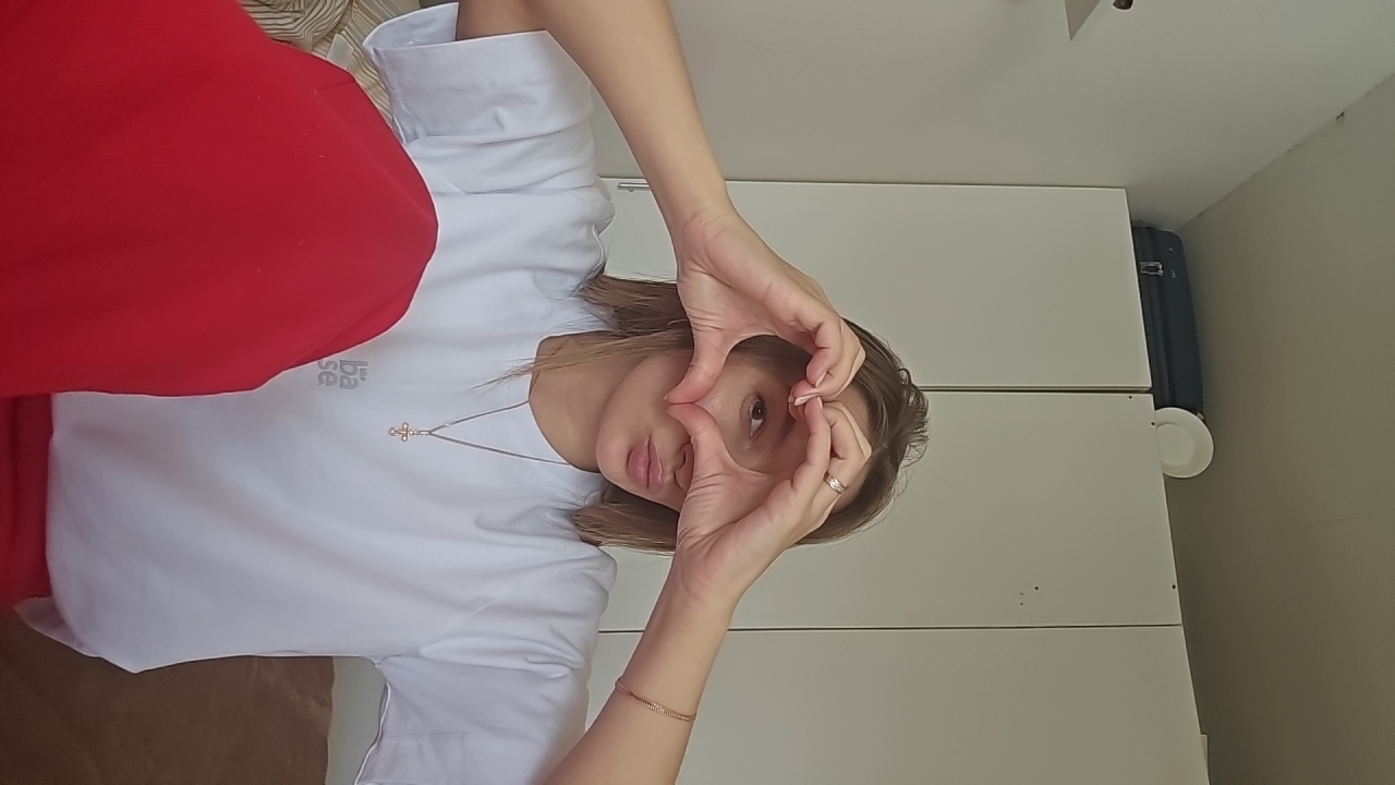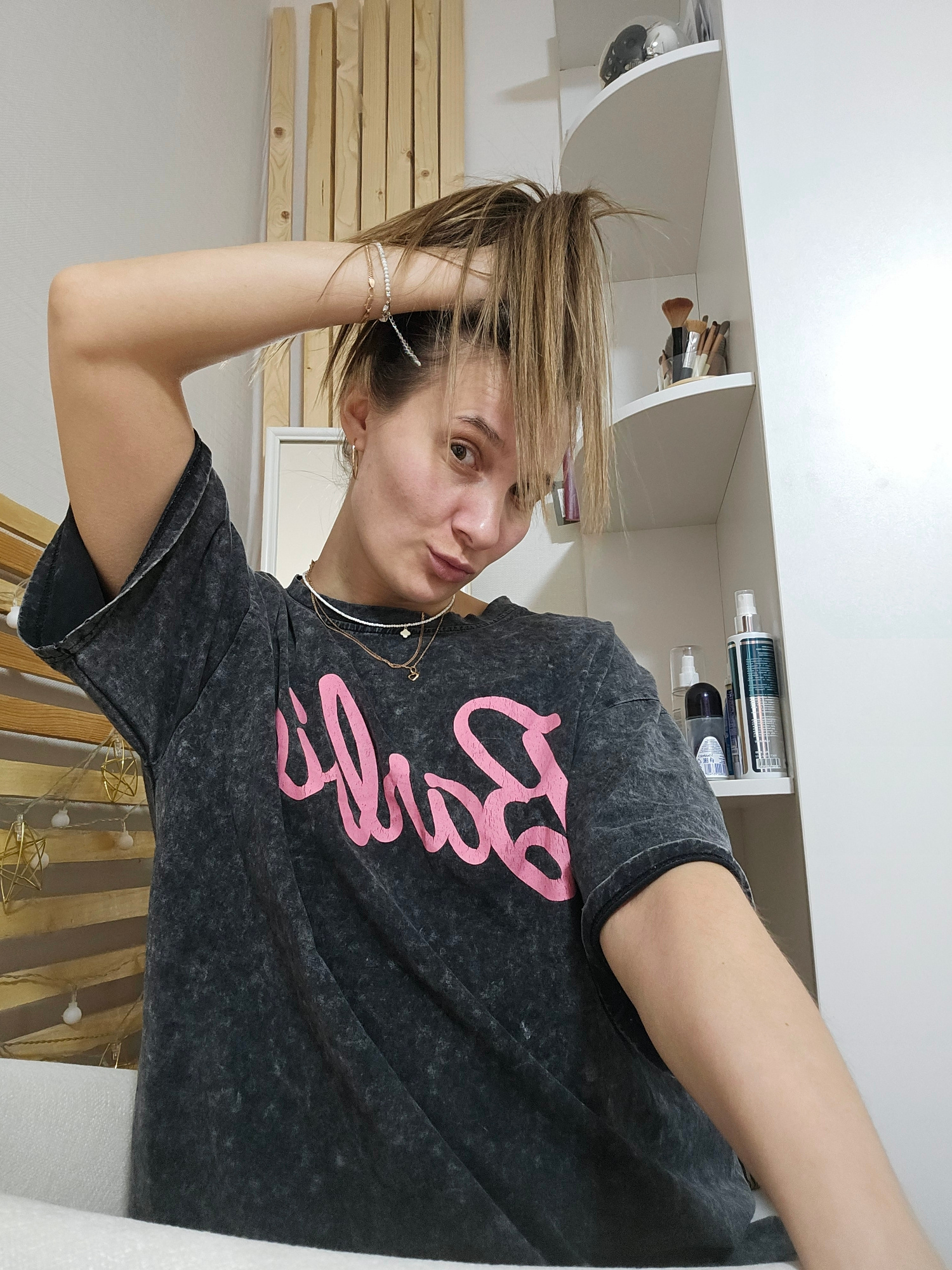 A woman is posing for a selfie in an indoor setting, possibly a bedroom. She has medium-length blonde hair and is wearing a gray t-shirt with the word "Barbie" in pink lettering. Her left arm is raise…read more