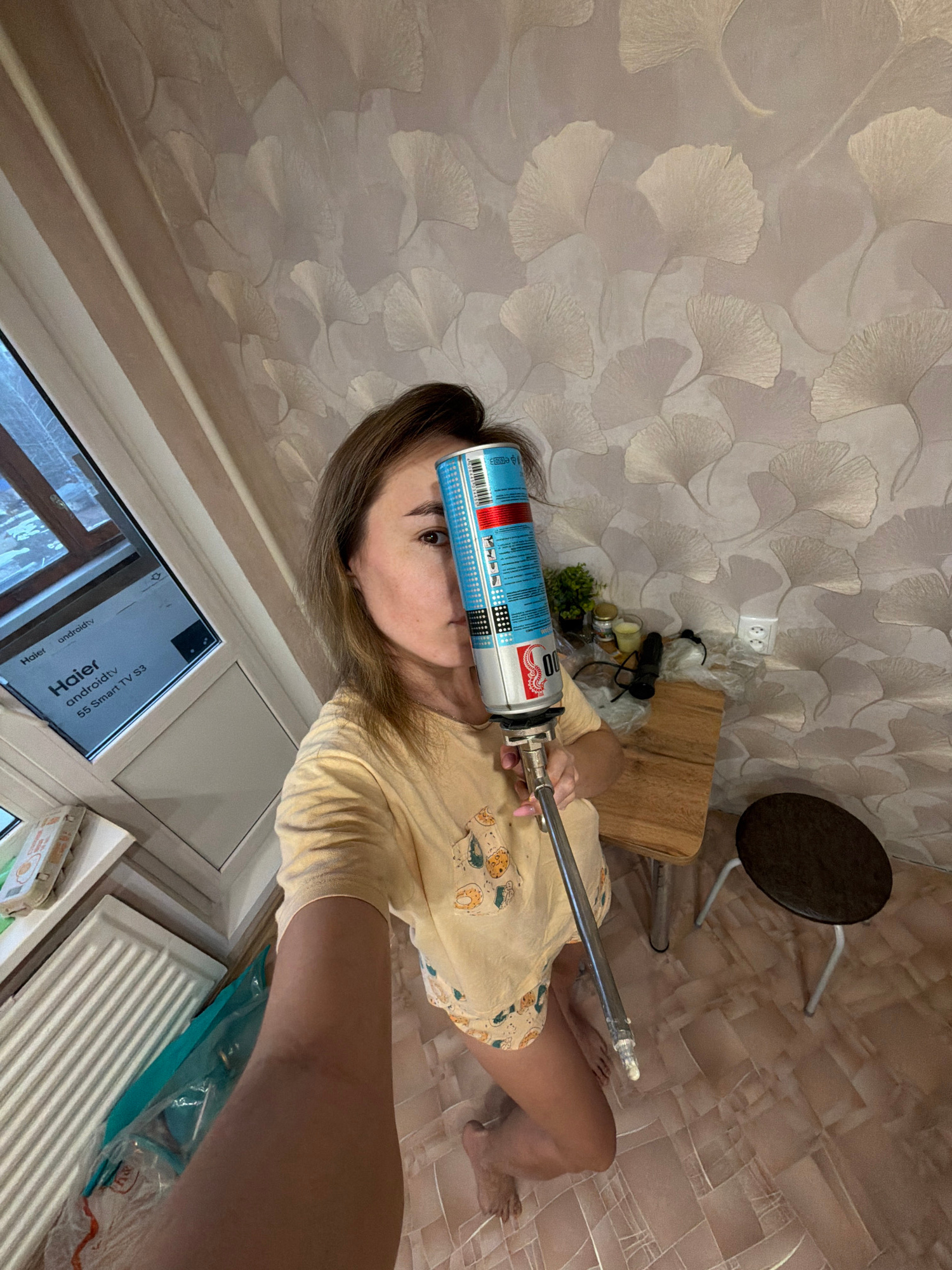 A woman is holding a can of construction foam with an application nozzle extension against her forehead. The location is likely inside a residential building in Izhevsk, Russia, based on the presence…read more