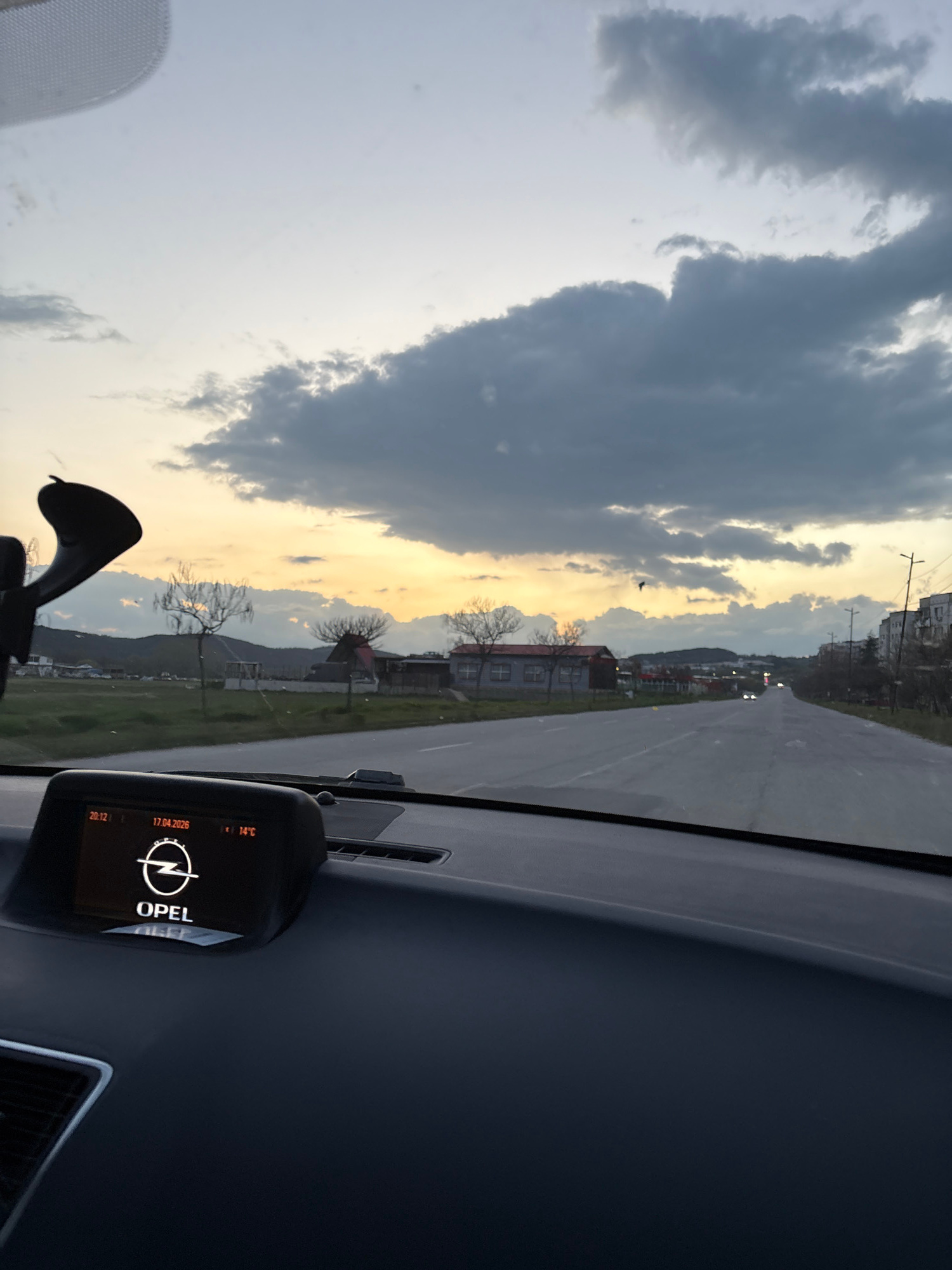 The image, taken from inside a car, shows a view towards the city of Panagyurishte, Bulgaria. The car's dashboard is visible, including a display indicating the Opel car brand and a temperature of 14°…read more