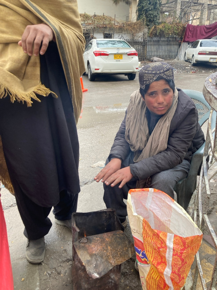 The image depicts an outdoor urban scene in Quetta City Tehsil, Pakistan, characterized by damp ground and an overcast environment. In the foreground, two individuals are present. On the left, a pers…read more