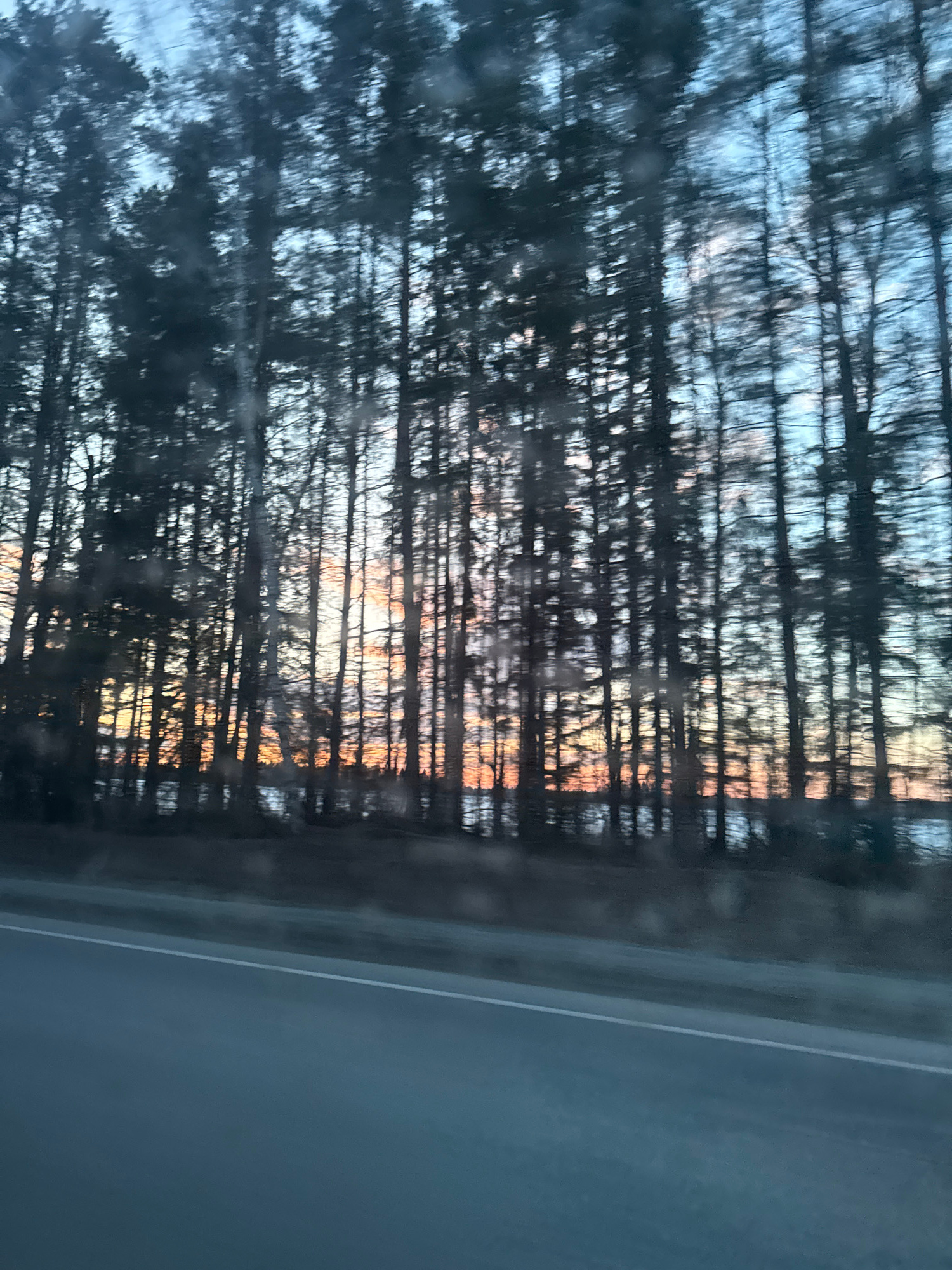 The image shows a blurry view of a forest at sunset, likely seen through a vehicle window. Thin, dark tree trunks and branches are silhouetted against a light, orange-tinted sky. A dark gray road is vā¦read more