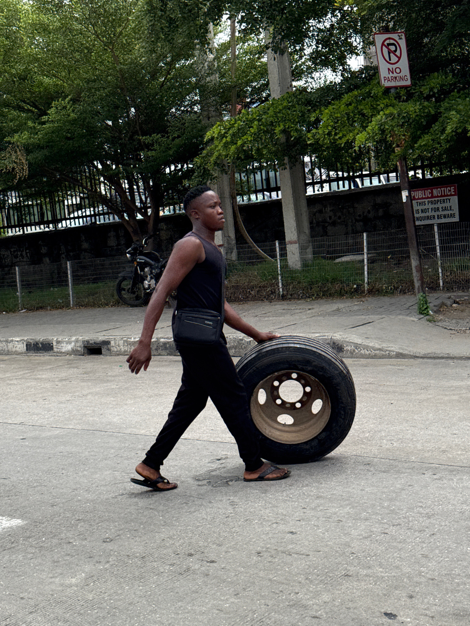 A medium outdoor shot shows a man rolling a tire on a paved street in Itirin, Nigeria. The man is dark-skinned and dressed in a black tank top and black pants. He is wearing sandals. The tire is large…read more