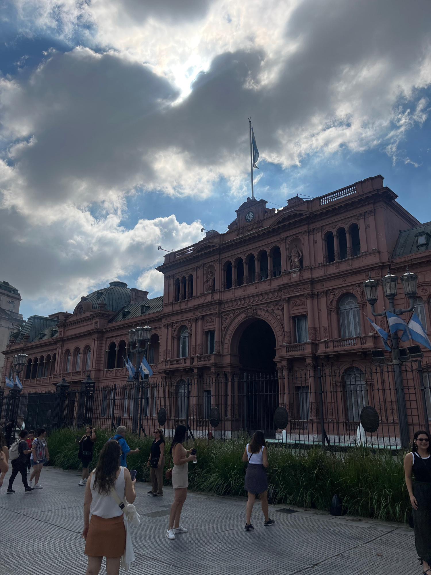 The image captures the Casa Rosada in Buenos Aires, Argentina, from a ground-level perspective. The pink-colored building occupies a significant portion of the frame, showcasing its architectural detaβ¦read more