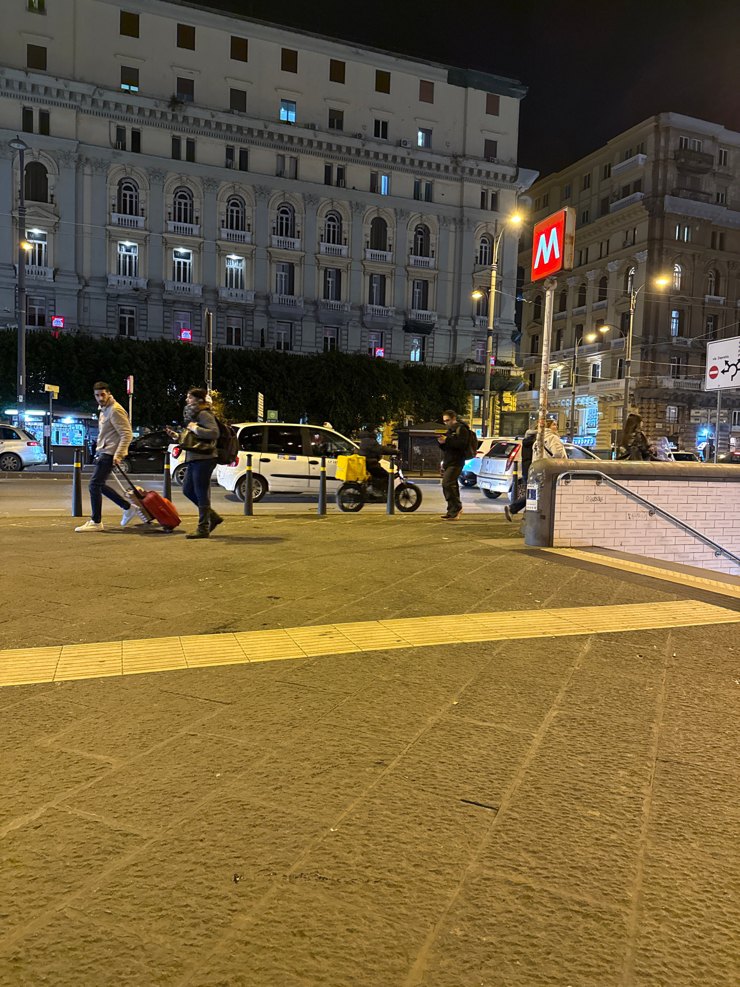 The image depicts a nighttime urban street scene near the Municipio Metro Station on Via Agostino Depretis, Naples, Italy. In the immediate foreground, a textured, light-brown cobblestone sidewalk ex…read more