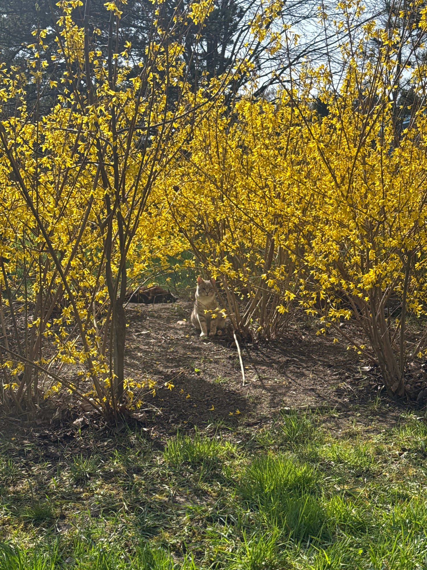 The image depicts a landscape scene. Two forsythia bushes, dense with bright yellow blossoms, dominate the foreground. A cat is between the bushes. The ground between the bushes is bare. To the right…read more