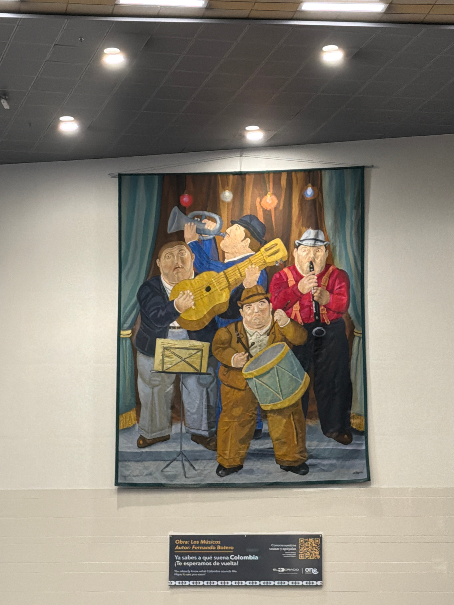 The image depicts a tapestry of Fernando Botero's "Los Músicos" hanging on a white wall. To the left of the tapestry, a vertical array of rectangular lights shines. A sign is located to the right of t…read more