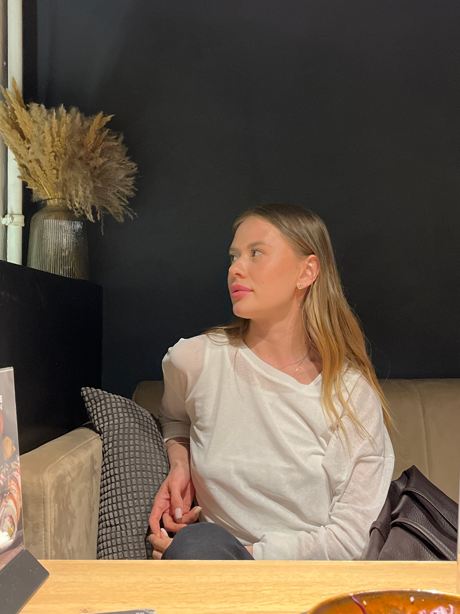 A woman with long blonde hair is sitting on a couch in what appears to be an indoor setting, possibly a restaurant. She is wearing a white long-sleeved shirt and is looking down. Her hands are clasped…read more