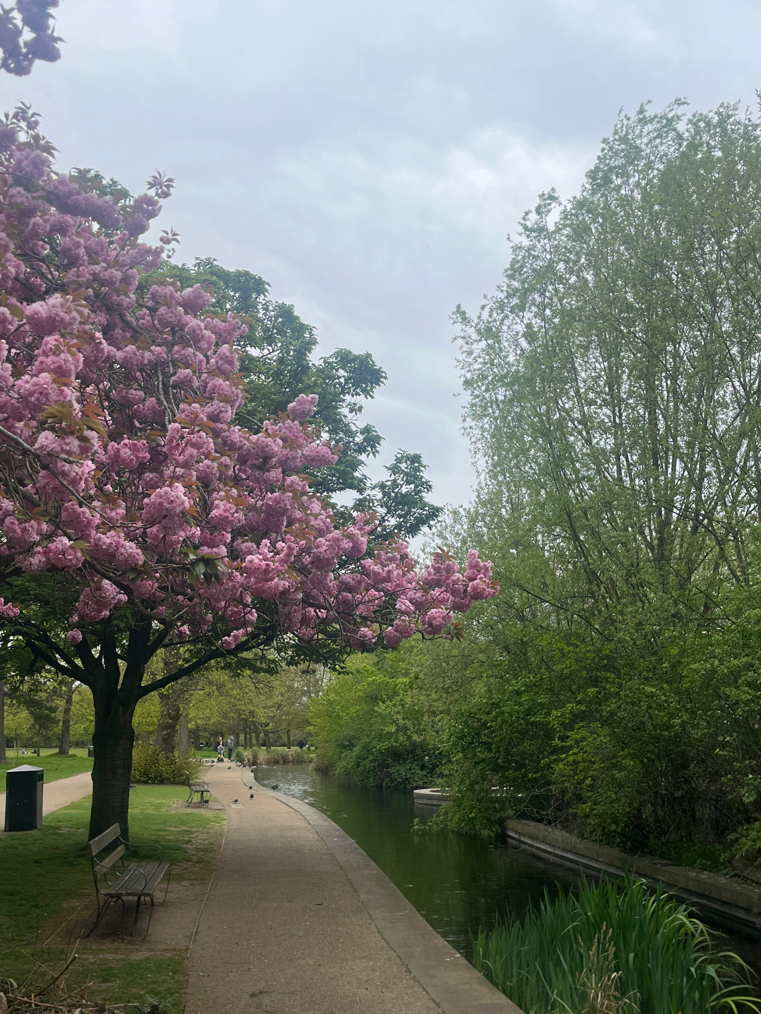 A photograph taken in London shows a path curving along a waterway, lined with trees. The path is made of light-colored concrete. To the left is a blooming cherry tree with pink blossoms. The waterway…read more