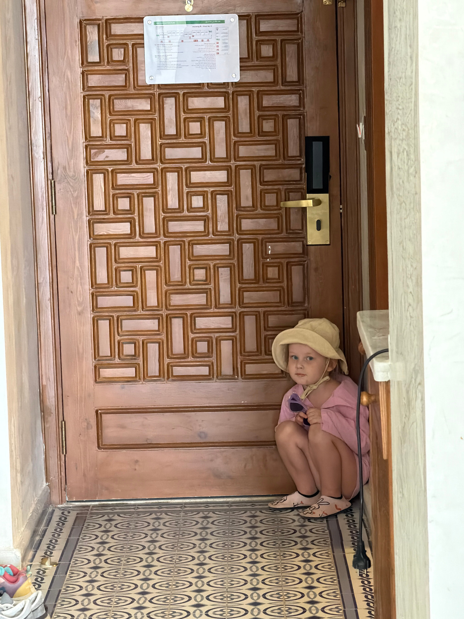 A medium, high-angle shot shows a child wearing a tan hat, a pink shirt, and bunny-patterned socks, crouched near a wall in a building. The child holds sunglasses and looks directly at the camera. A w…read more