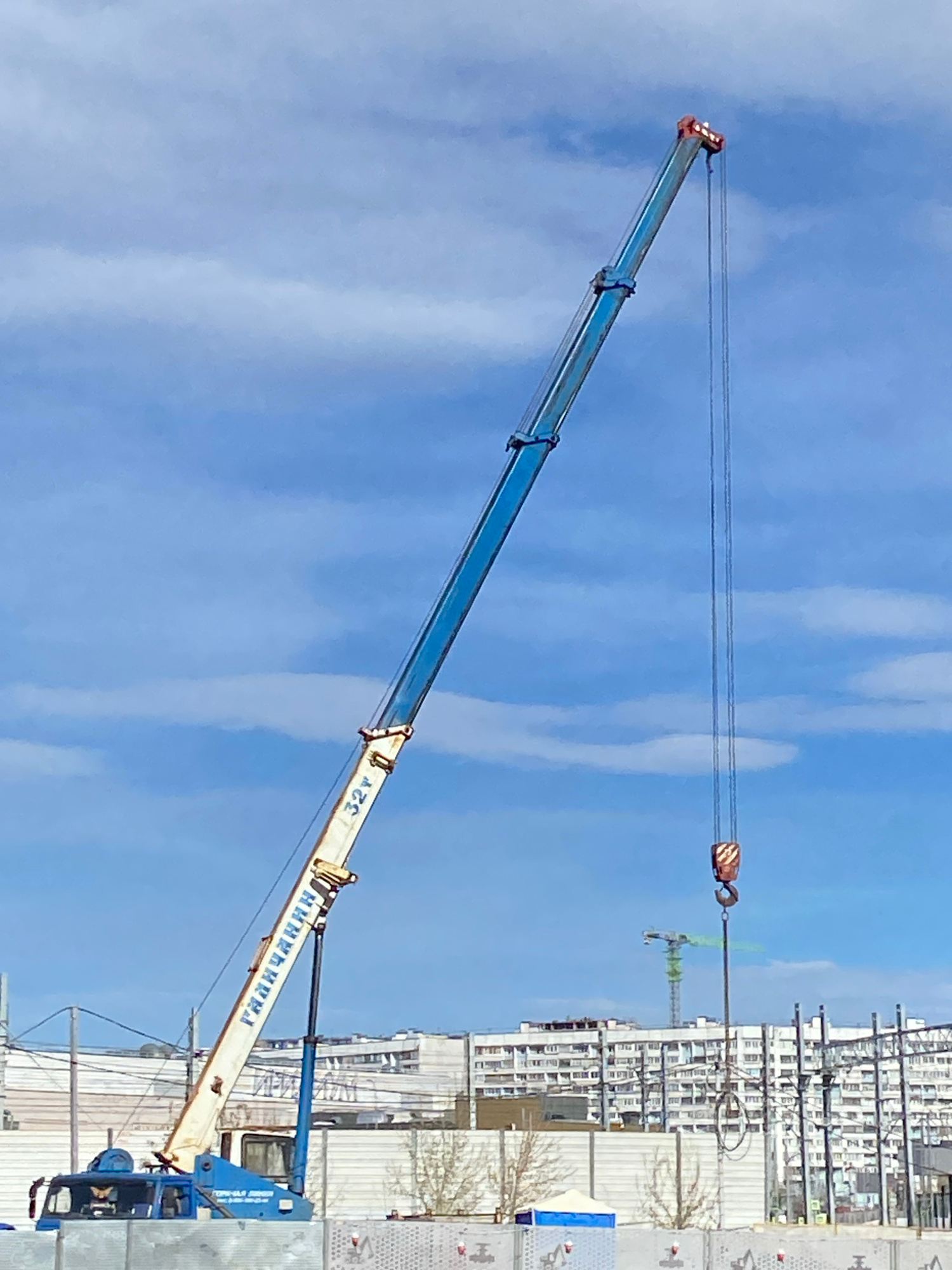 A vertical shot, oriented 90 degrees clockwise, captures a large mobile crane against a bright blue sky with scattered wispy clouds. The crane's long telescopic boom extends diagonally from the lower…read more